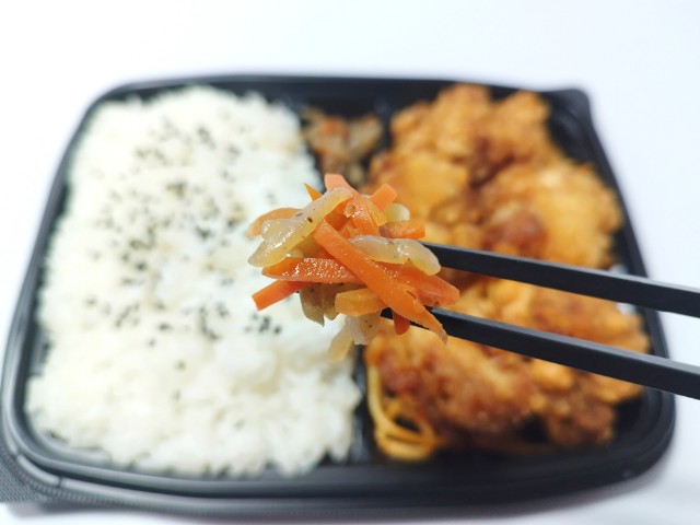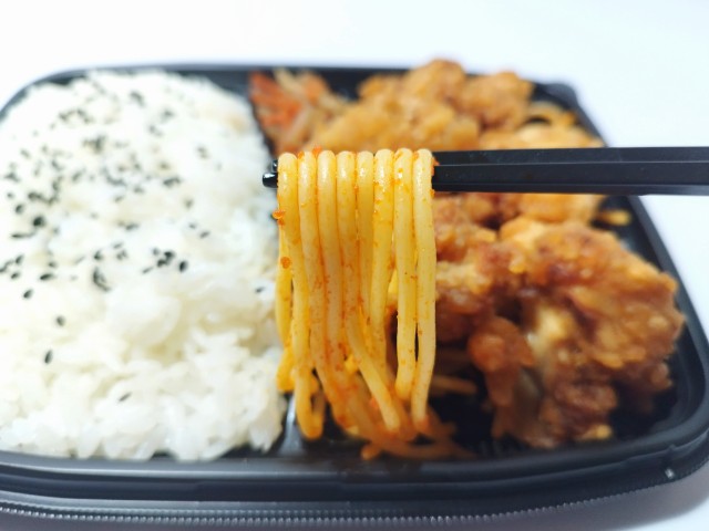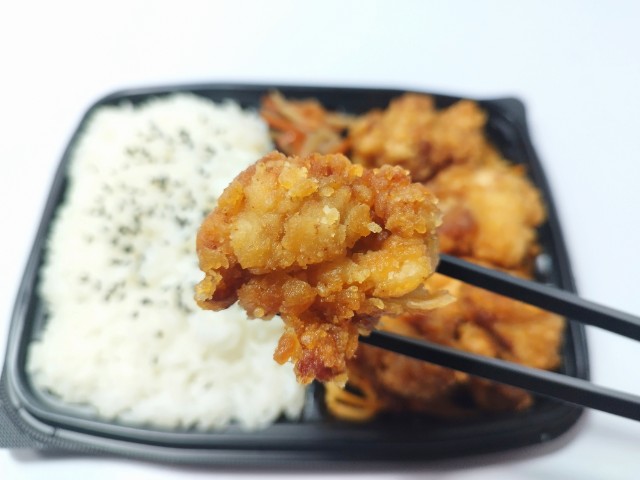 鶏唐揚げのお弁当です。以前の購入が2025年9月2日発売だったので、約5ヶ月近く経っていますが、価格が590円(税込637.20円)から638円(税込689.04円)へと変わっています。そんな若鶏の醤油唐揚げ弁当ですが、若鶏の唐揚げはややしっかりめの衣と柔らかい肉質の鶏肉、生姜とにんにくの風味があって、安定の美味しさです。また、醤油だれの味わいもしっかりとあるので、ご飯もどんどんと進みます。唐揚げの他にもきんぴらごぼうや下に敷いてあるスパゲティがありますが、こちらは箸休めといった感じだと思います。内容量は1食分にちょうどよく、お腹も満たされます。ぜひ若鶏の醤油唐揚げ弁当を食べてみて下さい。