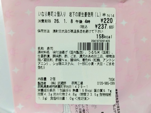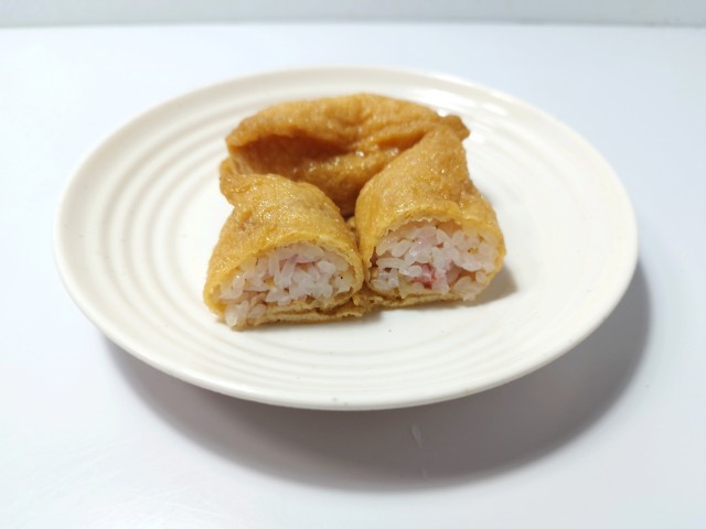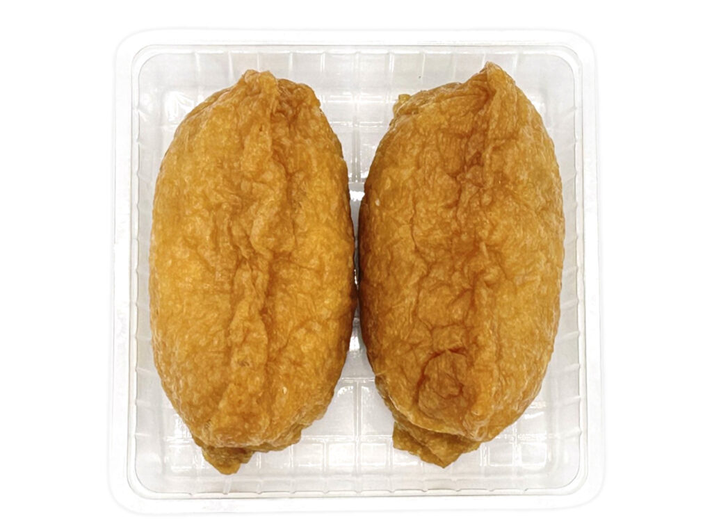 岩下の新生姜を使ったいなり寿司です。以前の購入が2025年8月5日発売だったので、約5ヶ月近く経ってますが、価格が250円(税込270円)から220円(税込237.60円)へと変わっています。余談ですが、前々回の2025年5月13日発売では238円(税込257.04円)だったので、内容量や食材の微妙な変更はあるのかもしれませんが、個人的には値下げを素直に喜んでいます。ちなみに三角形のいなり寿司でもある岩下の新生姜使用 新生姜いなり(2025年3月4日発売)は販売地域も広く、コンスタントに販売されている商品なので、店頭で見かけたり、食べた事がある方も多いと思います。こちらは俵型のいなり寿司になっていて、また違った魅力がある商品になっています。そんないなり寿司ですが、酢飯には刻まれた岩下の新生姜が混ぜ込まれてあって、見た目にも鮮やかです。実際に食べてみると、新生姜のシャキッとした食感とピリッとした辛味、生姜の風味が、ほどよい酸味の酢飯やジューシーなお揚げとよく合っていて、食べ出すと止まらなくなります。2個入ですが、1個はふた口サイズくらいなので、一人でも普通に食べ切れます。ぜひ岩下の新生姜使用のいなり寿司を食べてみてください。