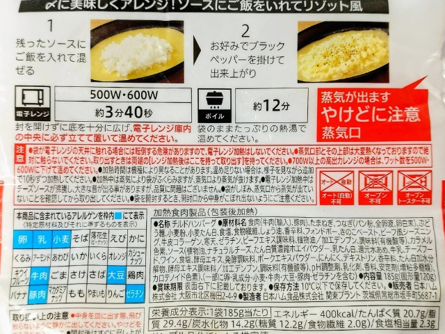熱量:400kcal、たんぱく質:20.7g、脂質:29.4g、炭水化物:14.2g(糖質:12.2g、食物繊維:2.0g)、食塩相当量:2.3g