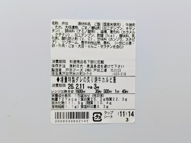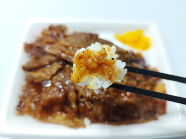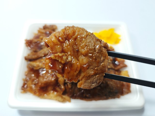 牛カルビを使った焼肉弁当です。以前の購入が2025年6月3日発売だったので、約8ヶ月以上経っていますが、価格が630円(税込680円)から647円(税込698円)へと変わっています。定番人気のお弁当でもある特製ダレの炙り焼牛カルビ重(2025年12月23日発売)ですが、今回は期間限定にて牛焼肉20%増量されて発売されています。ちなみにそんな牛カルビ重ですが、牛カルビご飯が見えないくらいに一面に敷かれていて、食べ応え抜群です。味付けのタレ味噌の風味コチュジャンの辛味を感じる甘辛い濃厚ダレで、このままタレご飯で食べても十分美味しいですが、牛カルビの脂と合わさる事でさらに美味しさを増します。牛カルビ柔らかい肉質ジューシーな味わいで、とにかくご飯が進みます。さらに今回は牛カルビ増量されているので、満足度もかなり高いです。内容量は1食分にちょうどよく、お腹も満たされます。ぜひ増量された特製ダレの炙り焼牛カルビ重を食べてみてください。