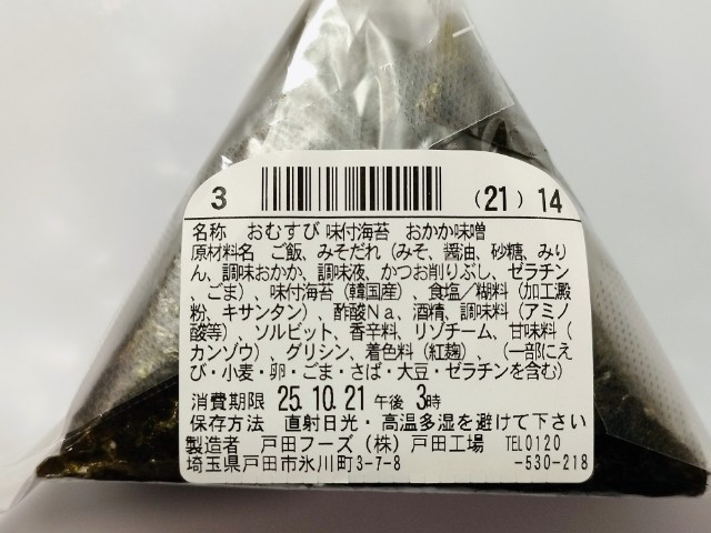 おかかと味噌ダレを使ったおむすびです。以前の購入が2025年6月17日発売だったので、約4ヶ月近く経っていますが、価格が161円(税込173円)から158円(税込170円)へと変わっています。そんなおむすびですが、おかか味噌はおかかの旨味と味噌の風味があって、ご飯が進む一品になっています。ご飯はふっくら食感で、パリッとした海苔ともよく合います。大きさは普通のおむすびサイズで、小腹が空いた時や主食にあと一品追加したい時にピッタリです。ぜひおかか味噌の手巻おむすびを食べてみて下さい。
