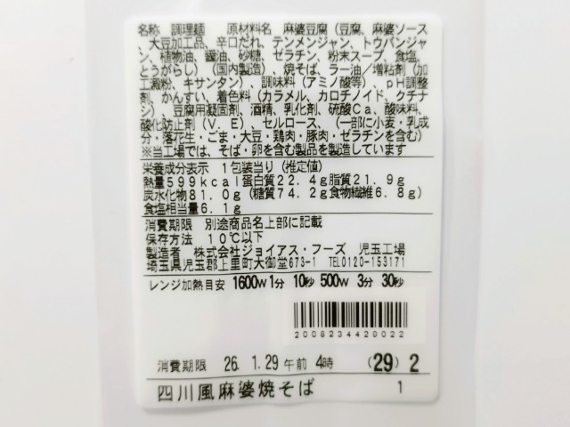 四川風麻婆焼そばです。以前の購入が2025年11月11日発売だったので、約2ヶ月以上経っていますが、価格は変わっていません。そんな四川風麻婆焼そばですが、麻婆あん醤の旨味ラー油の辛味花椒の風味があって、豆腐とのバランスも良いです。中華麺もちっとした食感歯切れの良さで、麻婆あんにもよく絡みます。商品名にもあるようにラー油がしっかりと効いていて、ひと口食べるとかなりビリビリとした辛味がやってくるので、辛いのが苦手な方は食べる時には注意した方が良いと思います。もちろん、麻婆豆腐焼そば間違いのない組み合わせなので、辛味以外は何ら問題ありません。内容量は1食分にちょうどよく、お腹も満たされます。ぜひ四川風麻婆焼そばを食べてみてください。