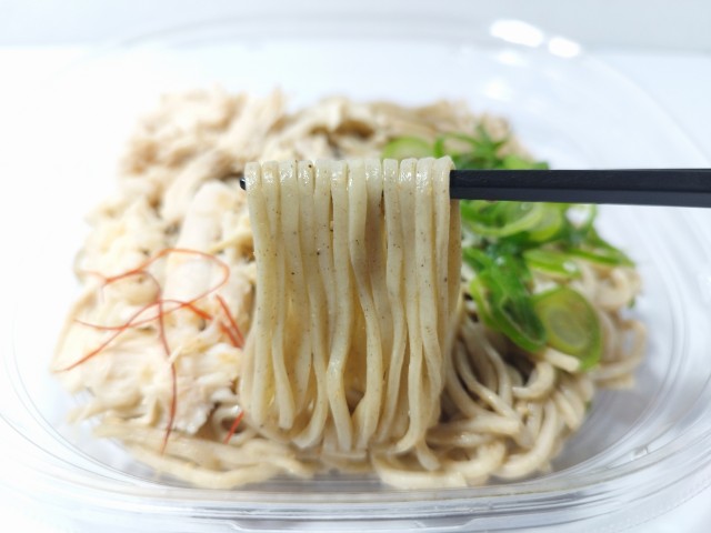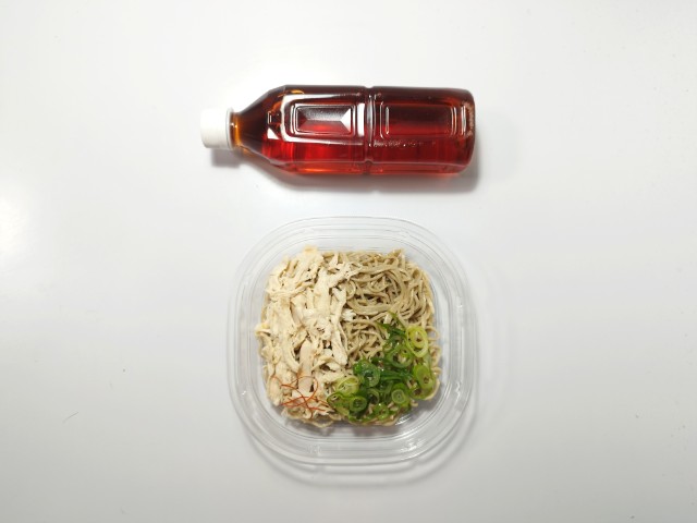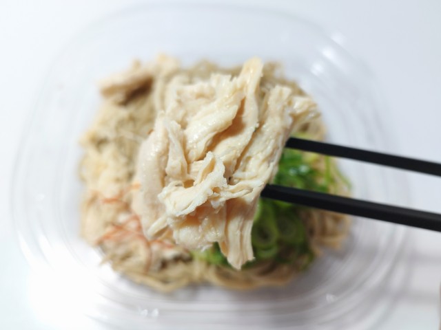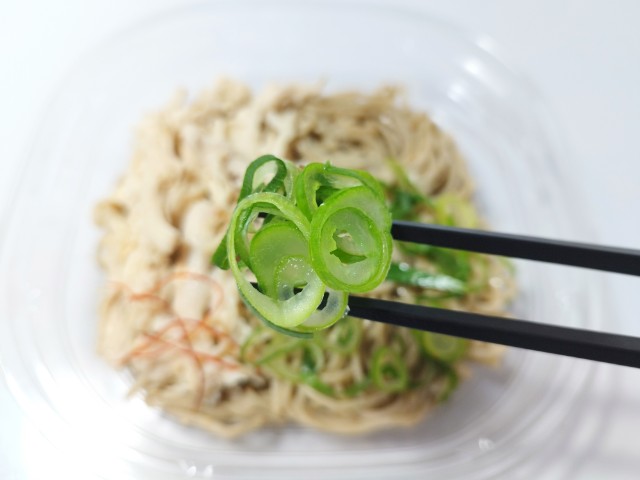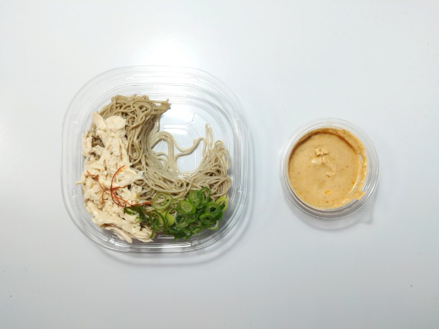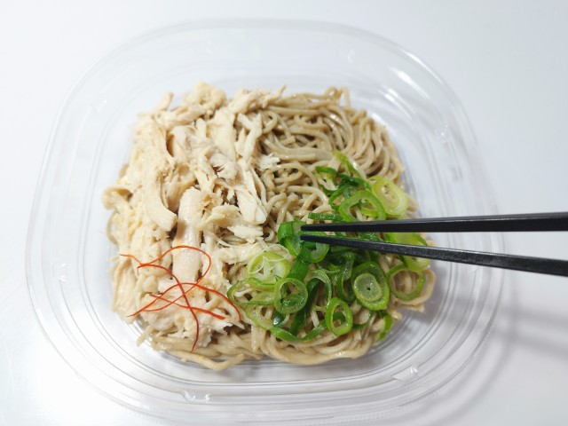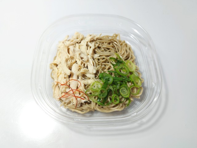 蒸し鶏とねぎなどがのった冷たいそばです。以前の購入が2025年9月23日発売だったので、約7ヶ月近く経っていますが、価格は変わっていません。そんな冷し蒸し鶏そばですが、そばはそばの風味とコシがあって、安定の美味しさです。具材の蒸し鶏は鶏の旨味としっとりとした食感、ねぎはシャキシャキとした食感とねぎの味わいで、それぞれ味や食感のアクセントになっています。そして、この商品の一番のポイントでもあるピリ辛濃厚ごまだれですが、胡麻の濃厚な味わいとピリッとした辛味があって、そばにも具材にもよく合います。特に蒸し鶏との組み合わせは、棒棒鶏を彷彿とさせる味になっていて、冷し蒸し鶏そばよりも冷し棒棒鶏風そばの方がしっくりくる印象です。内容量は1食分にちょうどよく、お腹も満たされます。ぜひ冷し蒸し鶏そばを食べてみてください。