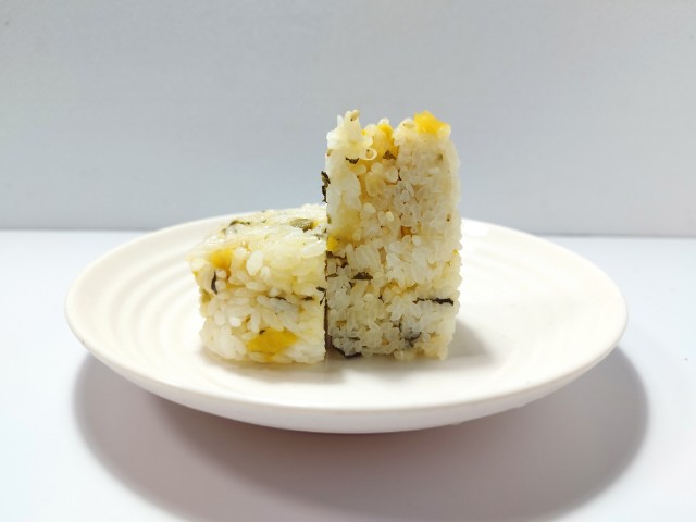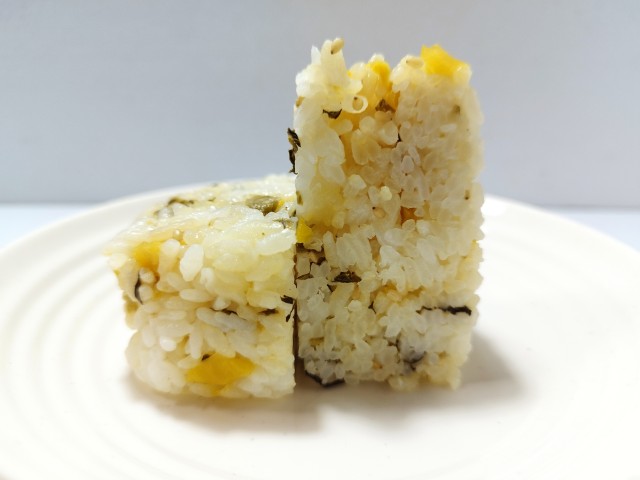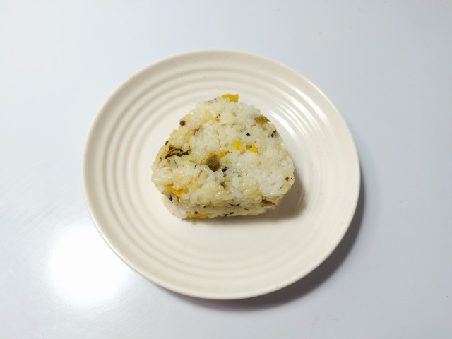 たくあんで食感を出し、高菜の風味がきいた、混ぜ込みタイプのおむすびです。