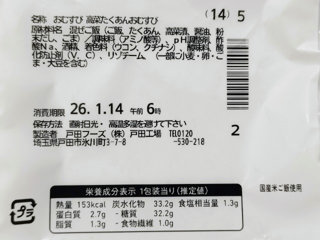 高菜たくあんなどを混ぜ込んだおむすびです。以前の購入が2025年7月1日発売だったので、約半年以上経っていますが、価格が135円(税込145円)から165円(税込178円)へと変わっています。そんなおむすびですが、だしの旨味たくあんと高菜の食感ごまの風味があって、安定の美味しさです。正直、塩味が強いイメージもありましたが、実際にはかなりあっさりとした味わいで、食べやすいおむすびになっていると思います。大きさは普通のおむすびサイズで、小腹が空いた時主食にあと一品追加したい時にピッタリです。ぜひ高菜たくあんおむすびを食べてみてください。