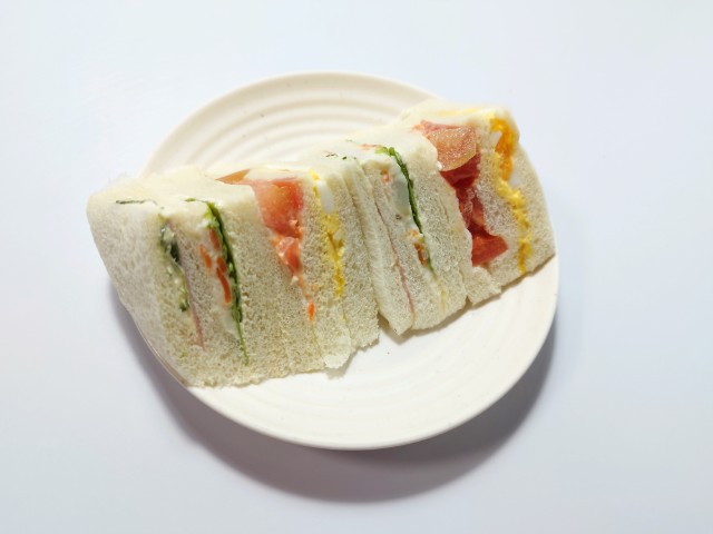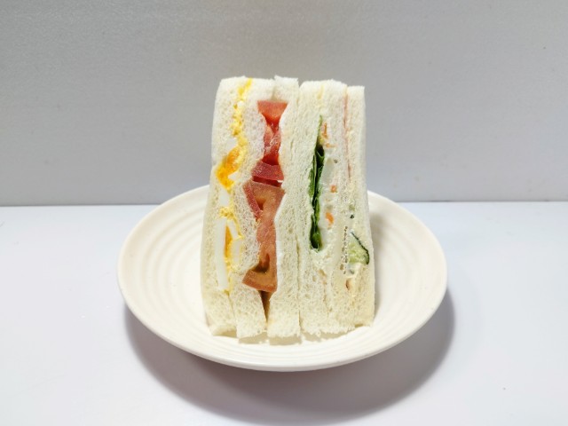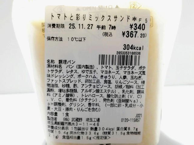 色々な具材を挟んだサンドイッチです。以前の購入が2025年7月9日発売だったので、約5ヶ月近く経っていますが、価格が358円(税込386.64円)から340円(税込367.20円)に商品名が彩り野菜ミックスサンドからトマトと彩りミックスサンドへと変わっています。そんなサンドイッチですが、具材にはトマトたまごサラダレタスポテトサラダハムきゅうりととにかく具材の多さに驚きます。トマトの酸味玉子の甘味レタスの食感ポテトサラダの味わいハムの塩味きゅうりの食感と色々な味や食感を楽しめるので、最後のひと口まで飽きずに食べられます。大きさは普通のサンドイッチサイズで、朝食小腹が空いた時にピッタリです。ぜひトマトと彩りミックスサンドを食べてみて下さい。