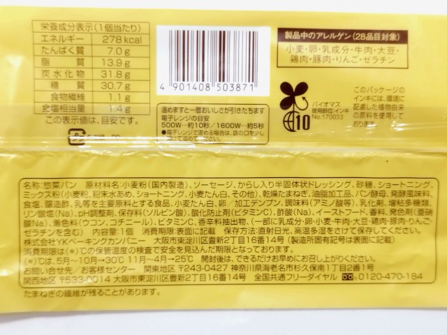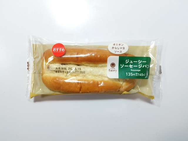 ソーセージとからしマヨソースがのった惣菜パンです。以前の購入が2025年8月5日発売だったので、約7ヶ月以上経っていますが、価格は変わっていません。そんなジューシーソーセージパンですが、生地はふんわりとした食感と歯切れの良さで、間違いのない美味しさです。ソーセージはパリッとした食感とジューシーな味わいで、生地とのバランスも良いです。ポイントはやはりからし風味のマヨソースで、からしの風味とマヨソースのほのかな酸味で、ソーセージパンの美味しさをさらに引き立てています。大きさは普通の惣菜パンくらいで、おやつや小腹が空いた時にピッタリです。ぜひジューシーソーセージパンを食べてみてください。