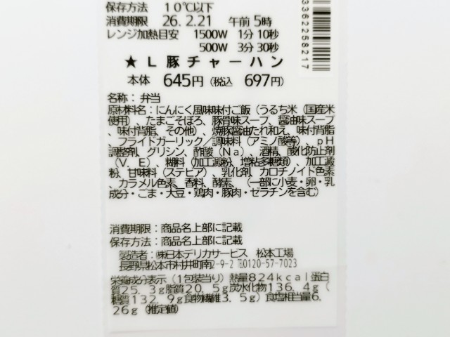 にんにく背脂と豚チャーシューがのったチャーハンです。以前の購入が2025年9月8日発売だったので、約5ヶ月以上経っていますが、価格は変わっていません。そんな背脂にんにく豚チャーハンですが、ご飯は豚のコクと醤油の風味、にんにくの味わいで、食べ出すと止まらなくなる美味しさです。付け合わせの豚チャーシューは豚の旨味とジューシーな肉質、にんにく背脂はプルンとした食感と脂の旨味、にんにくの風味で、チャーハンとの相性抜群です。見た目からも分かるようにかなりガッツリとしたチャーハンになっているので、食べ終わった後の満足度も高いと思います。内容量は1食分にちょうどよく、お腹も満たされます。ぜひ背脂にんにく豚チャーハンを食べてみてください。