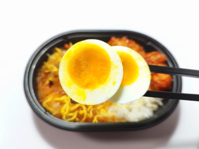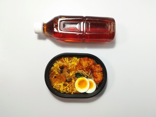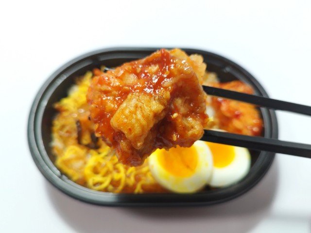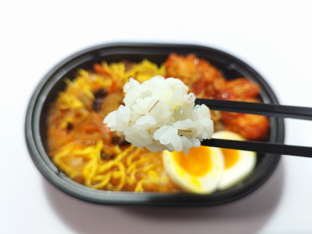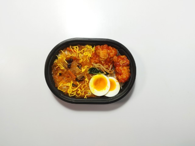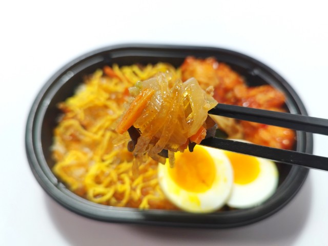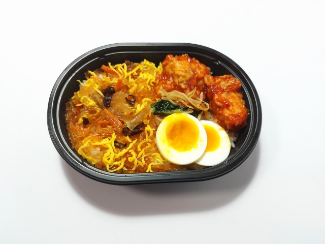 チャプチェやヤンニョムチキンなどがのったミニ弁当です。以前の購入が2025年9月16日発売なので約1ヶ月近く経っていますが、価格は変わっていません。今回は販売地域の変更にて再販されたといった感じで、今後も同様に色々な地域で発売されるのかもしれません。他にも細かな部分ですが、お弁当容器の色も今回変更されています。そんな牛挽肉チャプチェの韓国弁当ですが、チャプチェは牛の旨味やごま油の風味、ピリッとした辛味があって、ご飯が進む一品になっています。ヤンニョムチキンはジューシーな鶏肉とコチュジャンの辛味で、ハマってしまう美味しさです。他にもゆで玉子やもやしと小松菜のナムルなどがのっていて、最後のひと口まで飽きることなく食べられます。また、ご飯は麦ごはんになっているので、味だけでなく食感も楽しむ事が出来ます。ミニ弁当なので内容量は多くありませんが、小腹が空いた時や軽く済ませたい時などにピッタリです。ぜひ牛挽肉チャプチェの韓国弁当を食べてみて下さい。