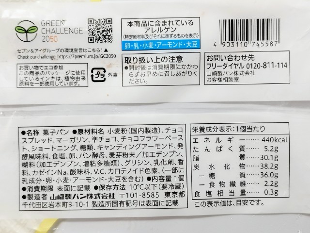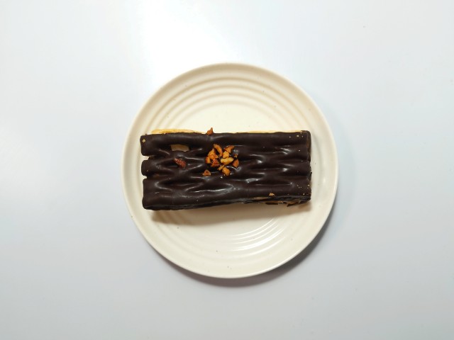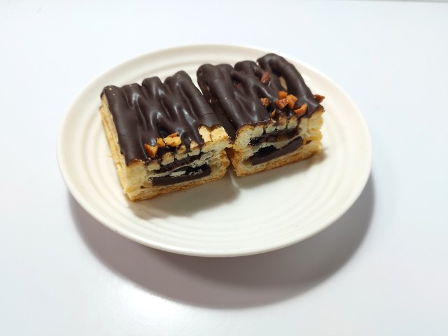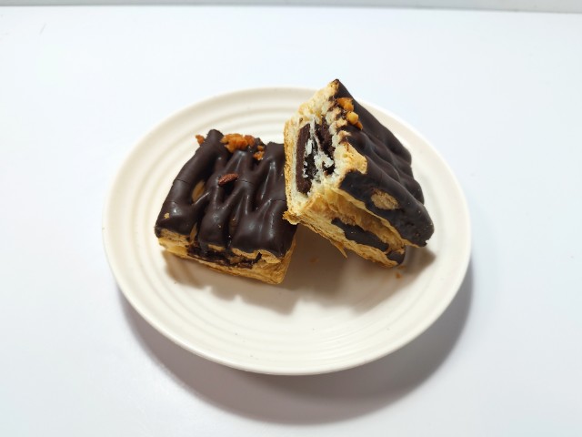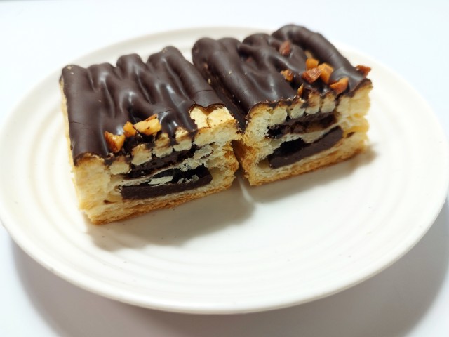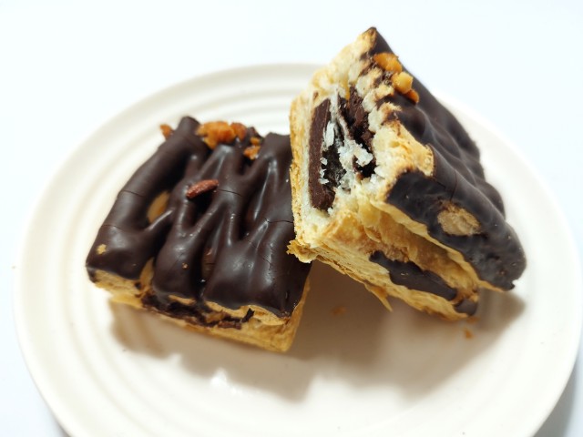 チョコとチョコクリームが入ったショコラパイです。チョコをふんだんに使ったショコラパイといった感じで、その見た目に惹かれて買ってみました。そんなベイクドショコラパイですが、生地はサクサクとした食感とほのかな塩味、香ばしさがあって、安定の美味しさです。また、生地にはチョココーティングとアーモンドがのっていて、チョコのやさしい甘味とアーモンドの食感を楽しめます。中にはチョコとチョコクリームが入っていて、チョコはホロッとした食感とビターチョコの味わい、チョコクリームはなめらかな食感と濃厚なチョコの甘味で、生地とのバランスも良いです。チョコづくしといった内容で、チョコが好きな方にはたまらない一品だと思います。内容量は一人分にちょうど良く、おやつや食後のデザートにピッタリです。ぜひベイクドショコラパイを食べてみて下さい。