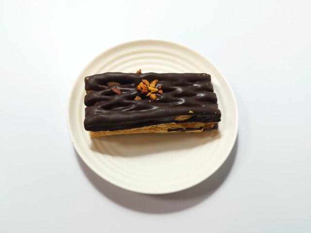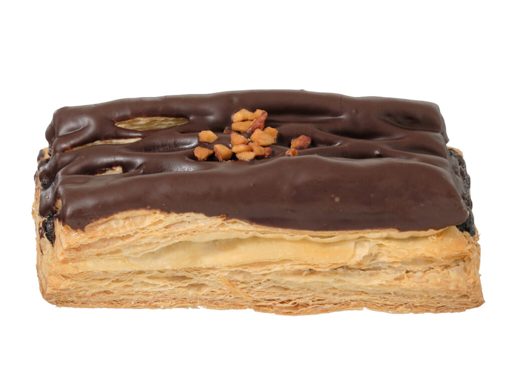 チョコを入れて焼き上げた生地にチョコクリームを入れ、コーチングチョコとアーモンドを上がけしたサクサク食感のショコラパイです。