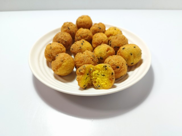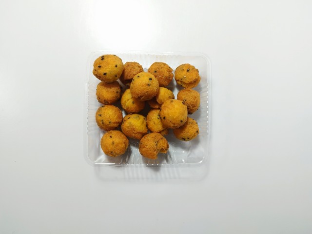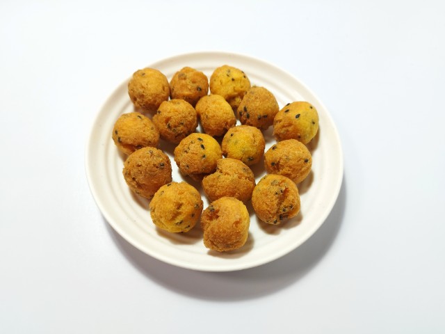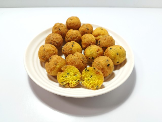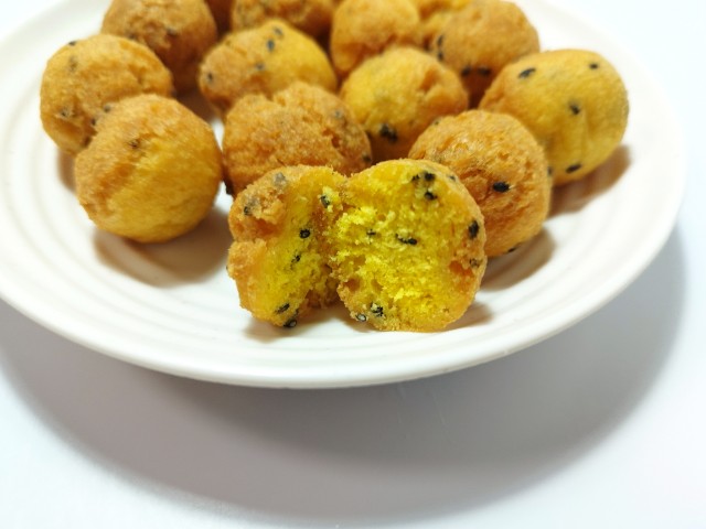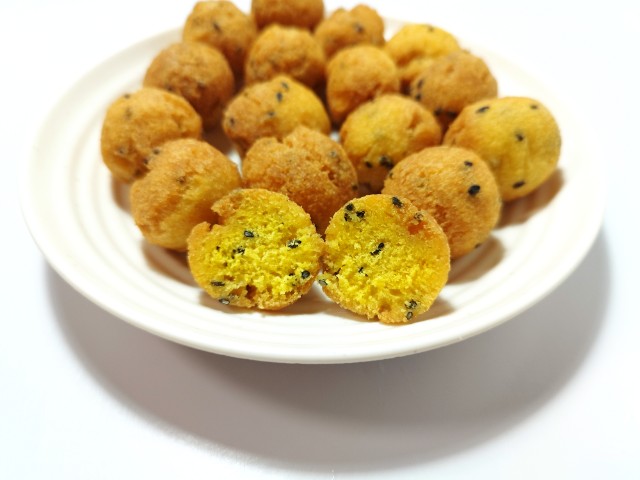 軽い食感でぱくぱく食べ進められる、お芋とごまの風味豊かなひとくちサイズのボールドーナツ16個入です。