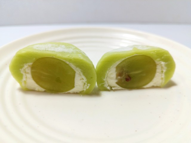 柔らかいもち生地で、みるくクリームとみずみずしいシャインマスカットを丸ごと一粒包んだ大福です。