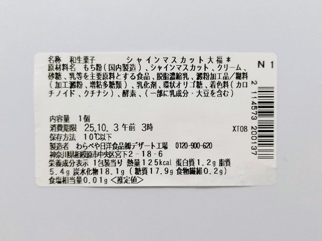 シャインマスカット一粒を包んだ大福です。セブンイレブンでは昨年の「旬を味わおう!秋の味覚祭」(2024年10月1日~10月14日)に続き、今年も「秋をほおばれ!」を9月23日より開催していて、今回の商品もその対象商品の一つとなっています。ちなみに以前にもまるっと一粒 シャインマスカット大福(2024年10月8日発売)がありましたが、今回は白こしあんではなく、みるくクリームへと変わっています。そんなシャインマスカット大福ですが、生地はもちもちとした食感とくちどけの良さで、安定の美味しさです。中のみるくクリームはなめらかな食感とミルクの風味、シャインマスカットはしっかりめの皮とジューシーな果肉で、生地とのバランスも良いです。大きさはひと口サイズで、お茶請けや軽く甘味が欲しい時にピッタリです。ぜひシャインマスカット大福を食べてみて下さい。