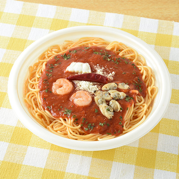 群馬県高崎市の名店「シャンゴ」監修です。ぷりぷり食感の押出生パスタです。辛口のトマトのソースに、海老・イカ・あさり・唐辛子・チーズをあわせ、パセリをトッピングしました。