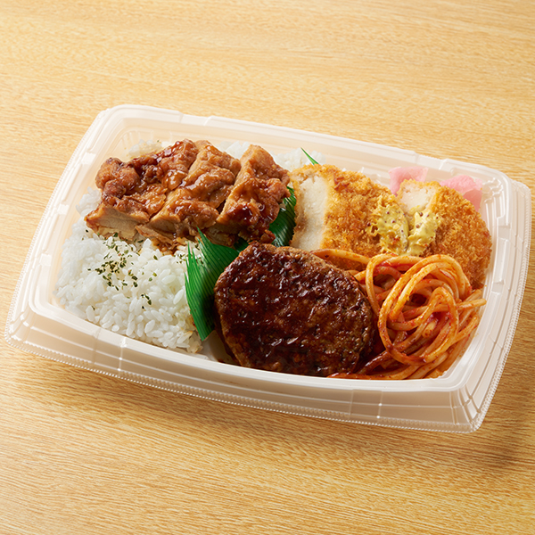 甘辛醤油で味付けした鶏から揚げや、デミハンバーグなどの肉系おかずを盛り合わせたお弁当です。※宮崎県、鹿児島県では取り扱いがございません。