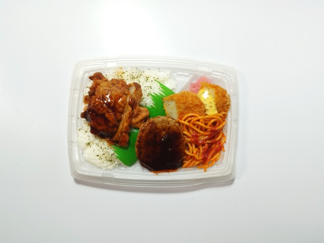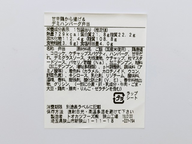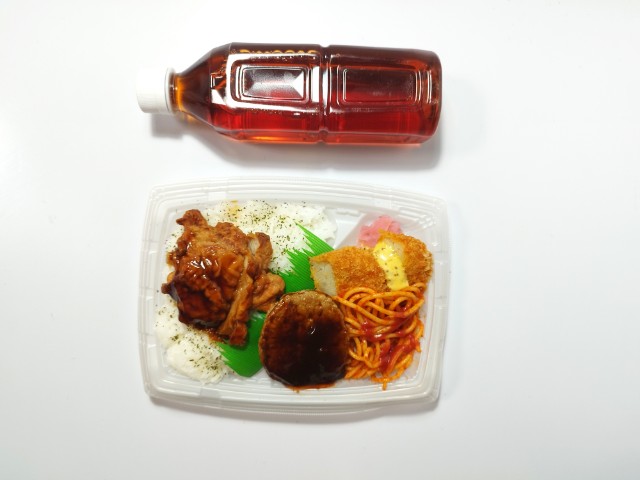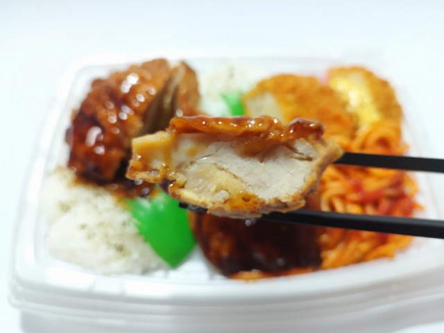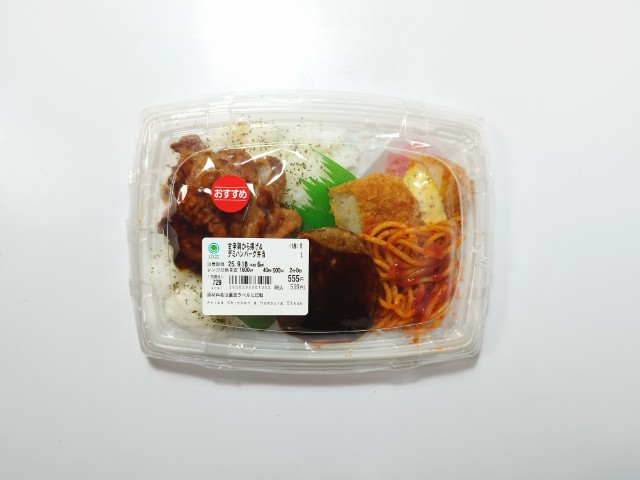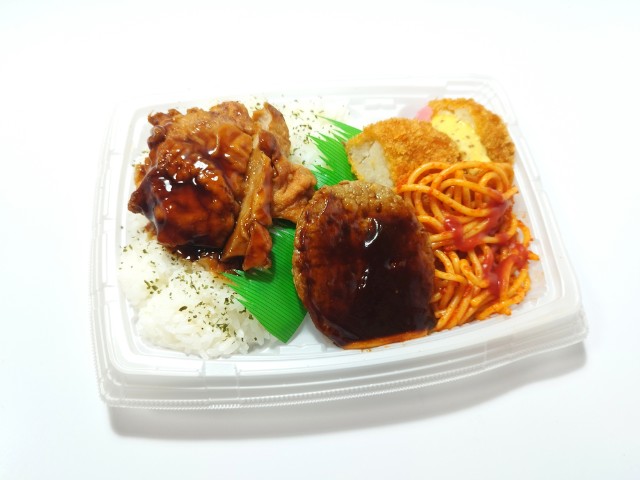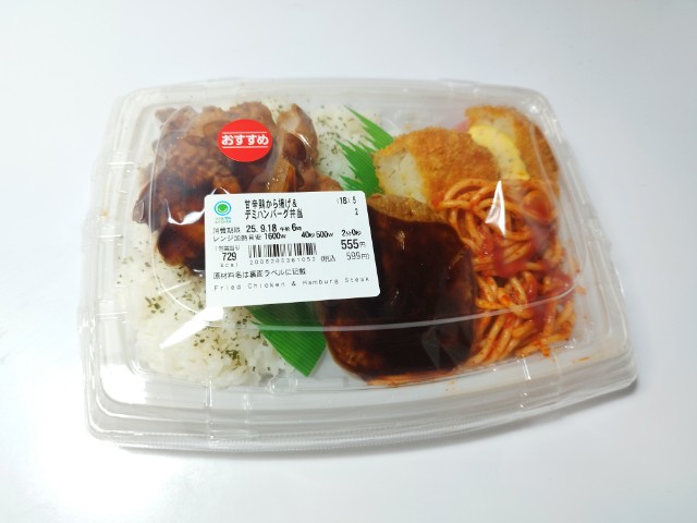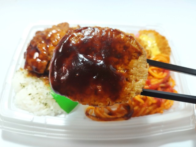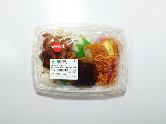 ファミリーマートの商品「甘辛鶏から揚げ&デミハンバーグ弁当」を食べてみました。