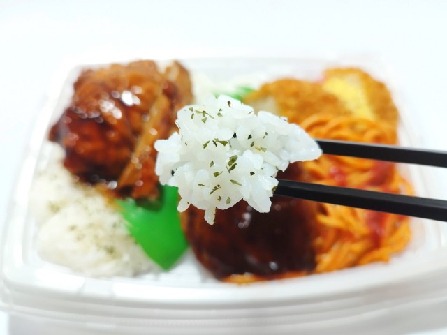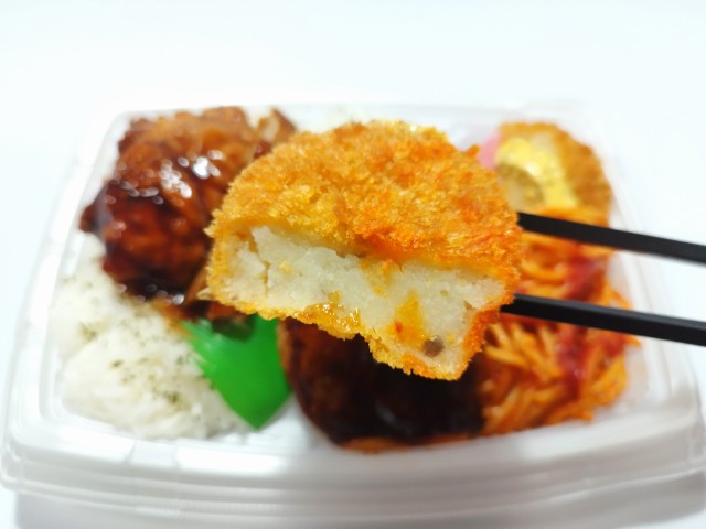鶏から揚げやデミハンバーグがのったお弁当です。以前にハンバーグ&から揚げ弁当(2025年4月15日発売)がありましたが、今回は鶏から揚げの味付けが甘辛醤油だったり、惣菜も少し増えています。そんな甘辛鶏から揚げ&デミハンバーグ弁当ですが、鶏から揚げは甘辛い味付けとジューシーな味わいで、ご飯が進む一品になっています。ハンバーグは箸でも簡単に切れる柔らかさで、デミグラスソースの味わいと肉の旨味があって、美味しいのひと言です。他にもコロッケやスパゲティもついていて、最後のひと口まで飽きることなく食べられます。内容量は1食分にちょうどよく、お腹も満たされます。ぜひ甘辛鶏から揚げ&デミハンバーグ弁当を食べてみて下さい。