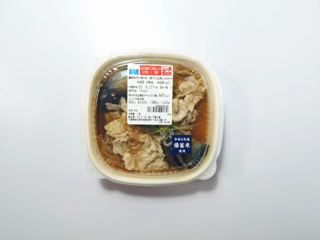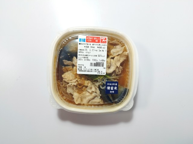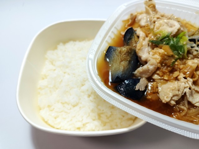 揚げナスと豚しゃぶがのったお弁当です。揚げナスと豚しゃぶの組み合わせに興味をそそられて買ってみました。そんな揚げナスと豚しゃぶ丼ですが、揚げナスはとろける食感とナスの味わい、豚しゃぶはふんわりとした食感と豚の旨味で、安定の美味しさです。やはりポイントは味付けでもある香味だれで、醤油の風味とにんにくの味わい、ほのかな酸味があって、濃厚な味わいながらも後味はさっぱりとしています。豚しゃぶはもちろん、揚げナスの美味しさもしっかりと引き立てていて、最後のひと口まで飽きることなく食べられます。そして、政府備蓄米使用のご飯ですが、香味だれがかかっている事によって、ご飯本来の味わいを楽しむといったものはそこにはないので、何ら違和感なく食べられると思います。内容量は1食分にちょうどよく、お腹も満たされます。ぜひ揚げナスと豚しゃぶ丼を食べてみて下さい。