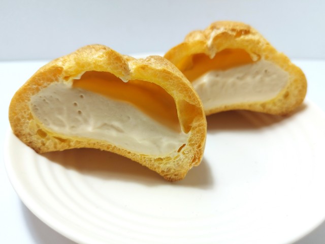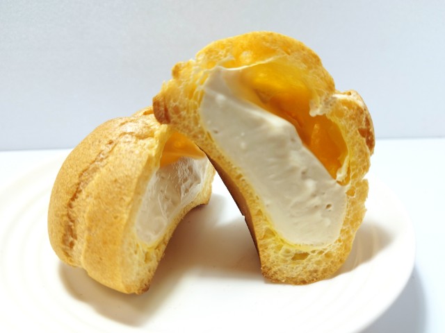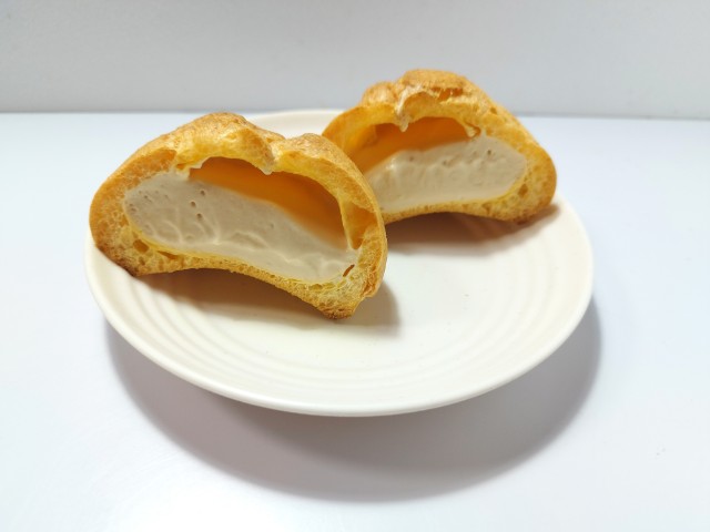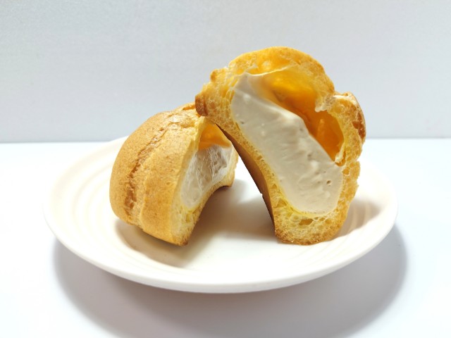 森永マミー風味シュークリームが入ったシュークリームです。森永乳業とコラボした商品で、個人的には楽しみにしていた新商品の一つでもあります。そんなシュークリームですが、シュー生地はふんわりとした食感と歯切れの良さで、安定の美味しさです。中のマミー風味のクリームはなめらかな食感とほのかな酸味、やさしい甘味があって、マミーを彷彿とさせる味わいです。コラボ商品としてのクオリティは高いと思いますが、何も知らずに普通のシュークリームとして食べると、さっぱりとした味わいにちょっと違和感を感じるかもしれません。大きさは普通のシュークリームサイズで、おやつや食後のデザートにオススメです。ぜひ森永マミー風味シュークリームを食べてみて下さい。