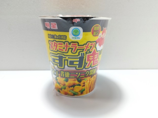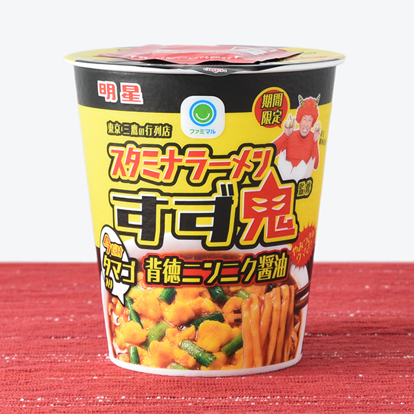 ファミリーマートの今週の新商品「【月見背徳メシ】元祖スタミナ満点らーめん すず鬼監修 背徳ニンニク醤油 今だけタマゴ入り」を食べてみました。