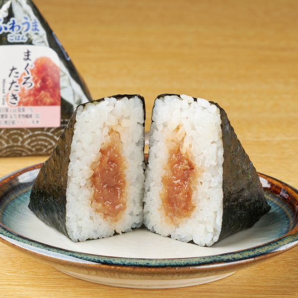 きはだまぐろのたたきを醤油ダレで味付けした青磯海苔のおむすびです。