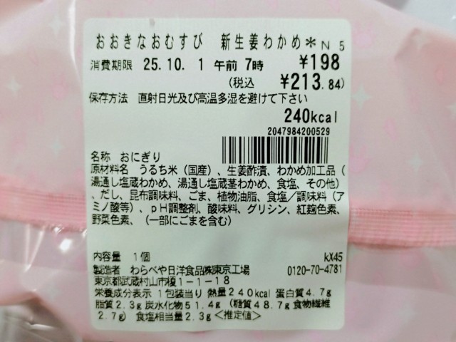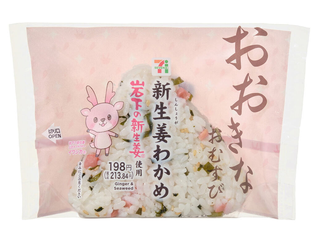 岩下の新生姜を使ったおおきなおむすびです。これまでセブンイレブンでの岩下の新生姜というと岩下の新生姜使用 新生姜いなり(2025年3月4日発売)やいなり寿司2個入り 岩下の新生姜使用(2025年8月5日発売)といった酢飯と合わせたいなり寿司での印象が強いですが、今回はおむすびとなっています。そんなおおきなおむすびですが、だしで炊かれたご飯には岩下の新生姜を始め、わかめやごまなどが混ぜ込まれていて、新生姜の風味やわかめの味わい、ごまの食感を楽しむ事が出来ます。新生姜が入っている事で、かなりさっぱりとしたおむすびになっていて、おおきなおむすびでもあっさりと食べられます。ただ、個人的にはご飯との配分を考えるともう少し新生姜が入っていた方が新生姜のシャキッとした食感をより楽しめると思います。大きさは普通のおむすびよりもやや大きめなので、このおむすび1個でお腹も軽く満たされます。ぜひ新生姜わかめのおおきなおむすびを食べてみて下さい。