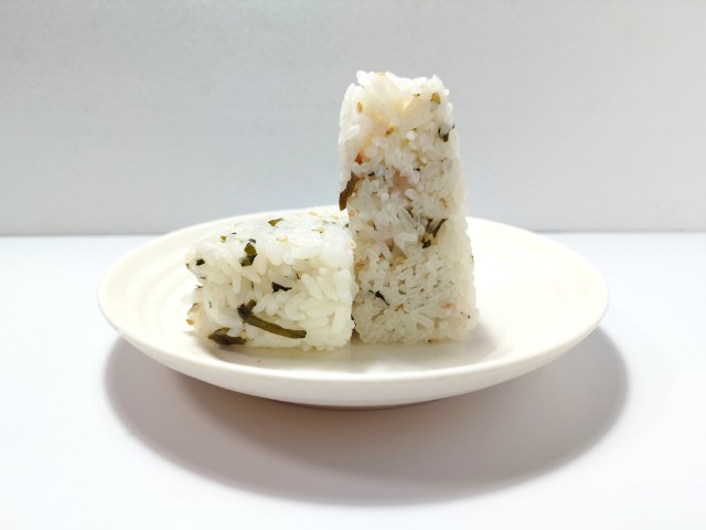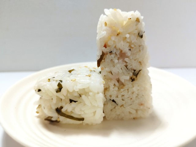 かつおと昆布のだしで炊いた御飯に、三陸産わかめと新生姜を混ぜ込んださっぱりとした味わいのおむすびです。