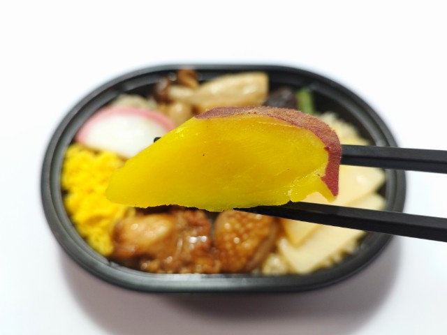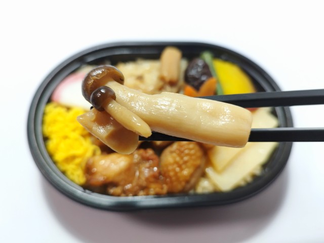 鶏肉やぶなしめじ、さつまいもなどがのったミニ弁当です。セブンイレブンでは昨年の「旬を味わおう!秋の味覚祭」(2024年10月1日~10月14日)に続き、今年も「秋をほおばれ!」を9月23日より開催していて、今回の商品もその対象商品の一つとなっています。そんなお弁当ですが、ご飯はほんのりとした味わいのだしごはんになっていて、ご飯だけでも美味しく食べ進められます。おかずには鶏肉やぶなしめじ、さつまいも、かまぼこなどがのっていて、それぞれの味や食感を楽しめます。旬の具材が多く使われていて、彩りの良さとその味わいからかなり満足度の高いお弁当になっていると思います。ミニ弁当なので内容量は多くありませんが、小腹が空いた時や軽く済ませたい時などにピッタリです。ぜひ鶏釜めし仕立てを食べてみて下さい。