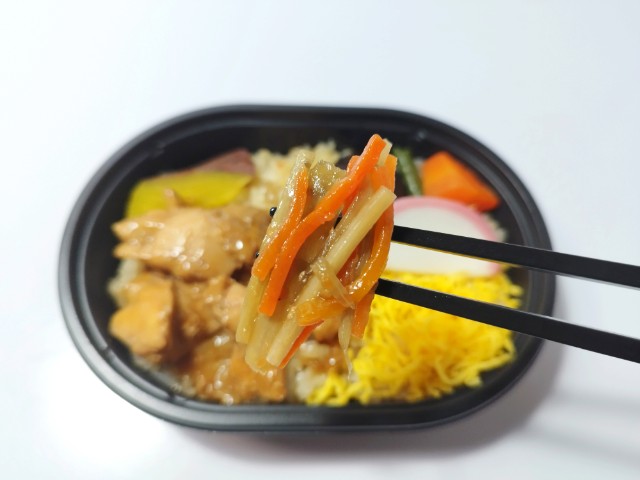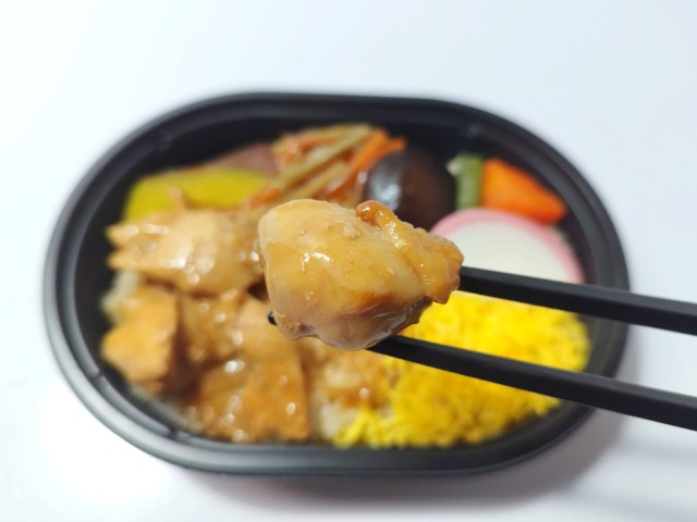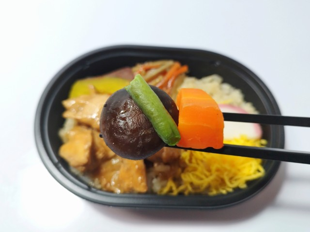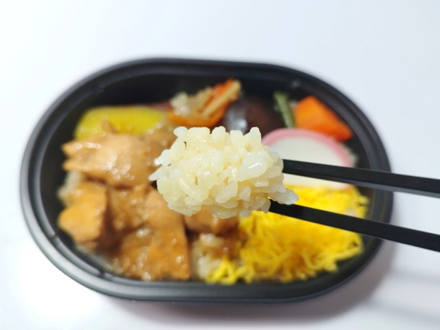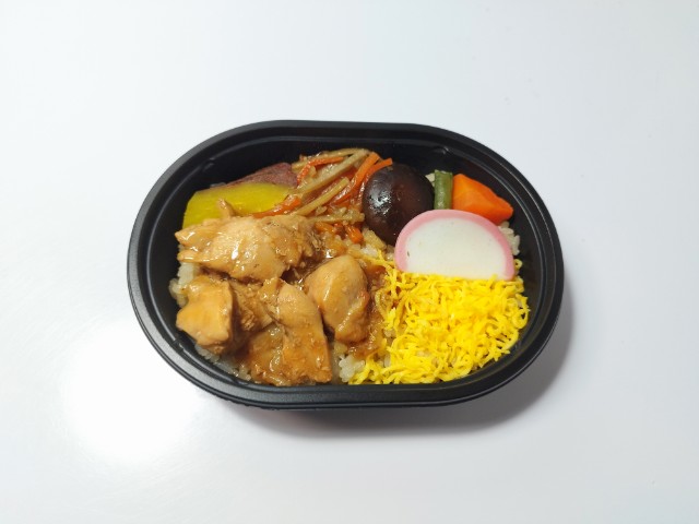 鶏肉や煮物、きんぴらごぼうなどがのったミニ弁当です。以前の購入が2025年9月30日発売だったので、約5ヶ月近く経っていますが、価格が398円(税込429.84円)から430円(税込464.40円)に商品名が秋の味覚 鶏釜めし仕立てから鶏釜めし仕立てへと変わっています。そんなお弁当ですが、ご飯はほんのりとした味わいのだしごはんになっていて、ご飯だけでも美味しく食べ進められます。おかずには鶏肉や煮物、さつまいも、かまぼこなどがのっていて、それぞれの味や食感を楽しめます。全体的には和風のおかずが多く、落ち着いたその味と食材の多さで、満足度もかなり高いお弁当になっていると思います。ミニ弁当なので内容量は多くありませんが、小腹が空いた時や軽く済ませたい時などにピッタリです。ぜひ鶏釜めし仕立てを食べてみてください。