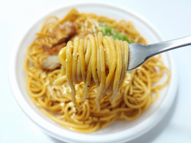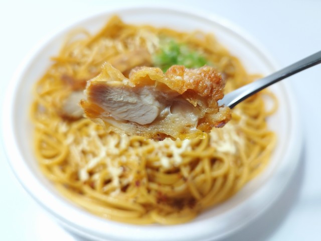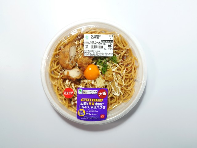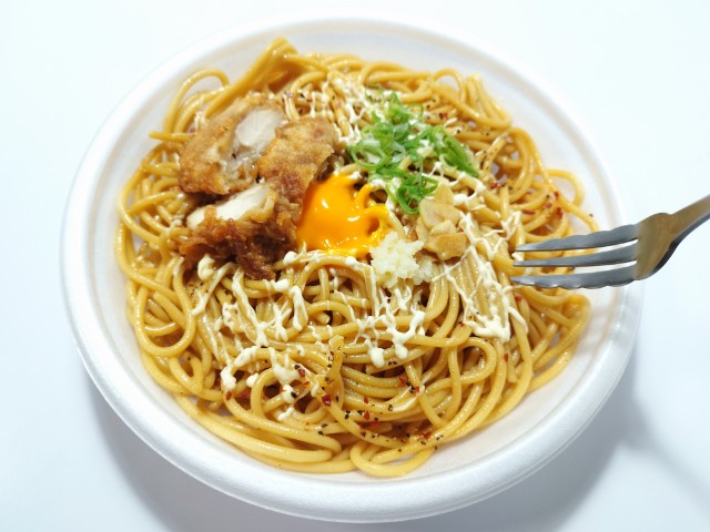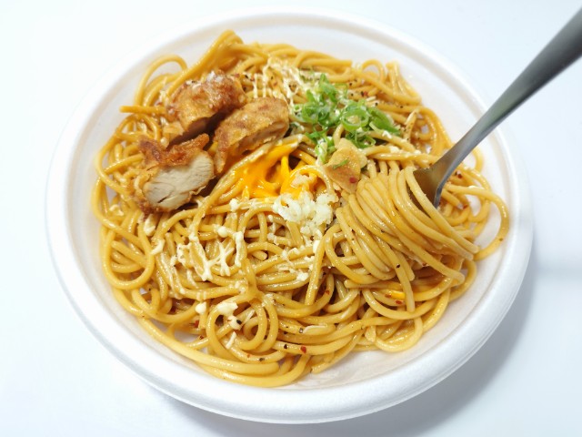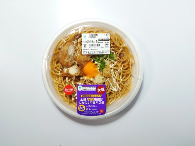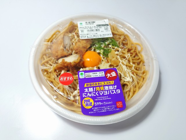 ファミリーマートの今週の新商品「【月見背徳メシ】大盛 太麺! 月見唐揚げにんにくマヨパスタ」を食べてみました。