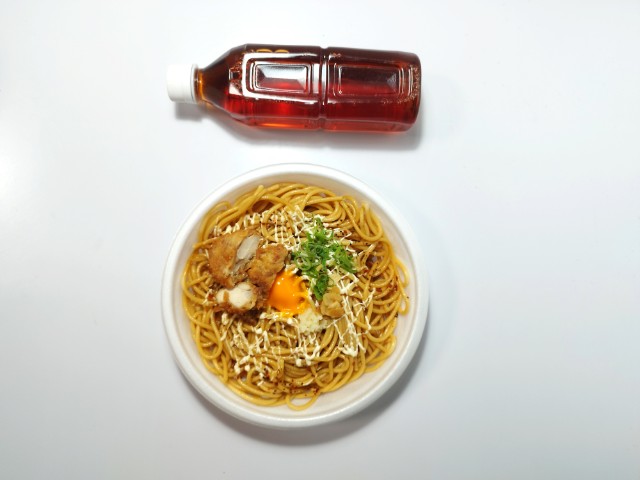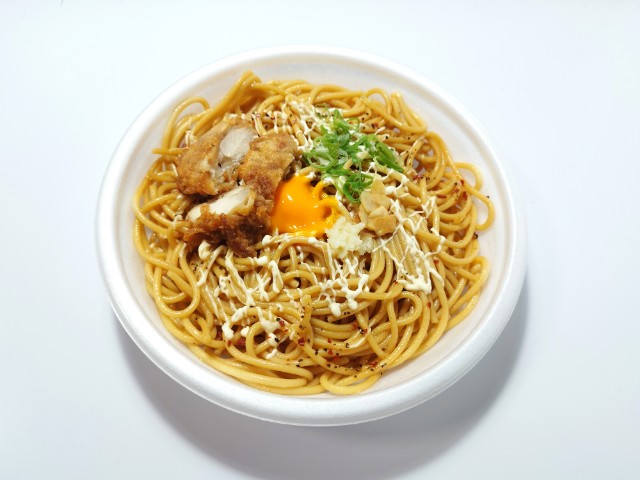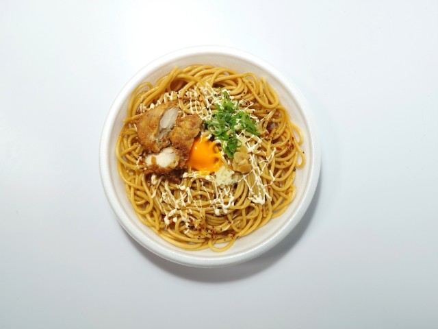 醤油ベースに豚骨や鶏がらの旨みを合わせた大盛パスタに、にんにくとマヨのアクセントを加えた最後まで食べ飽きない仕立てです。麺は食べ応えのある太麺を使用しています。卵黄風ソースやから揚げ・にんにくチップ・みじん切りにんにく・青ねぎをトッピングしました。