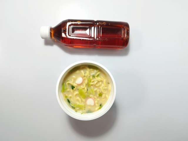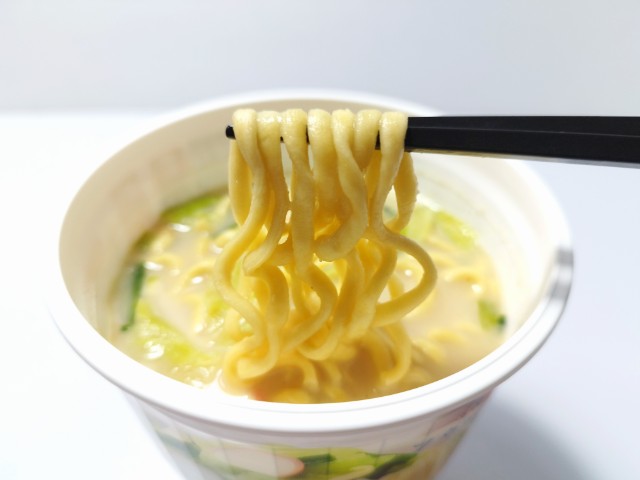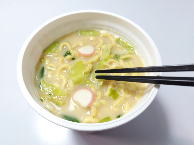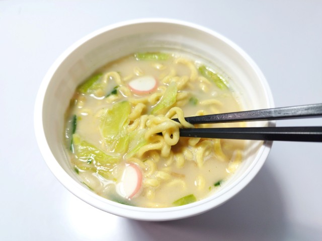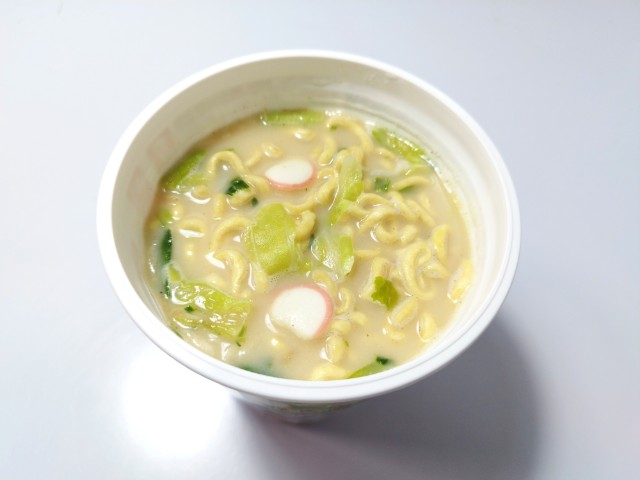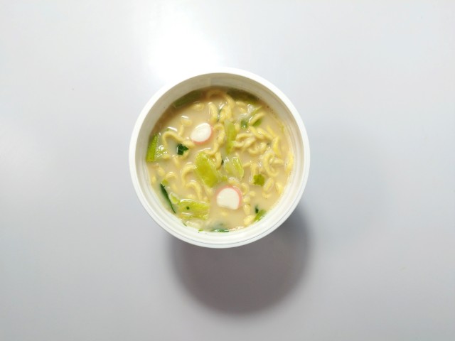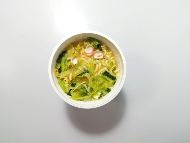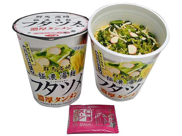 極濃湯麺フタツメ監修の濃厚タンメンです。セブンイレブン限定のカップ麺で、熱湯を入れて5分後に容器の中に入っていた液体スープを加えて、よくかき混ぜて完成となります。そんな濃厚タンメンですが、白濁スープは豚の旨味と魚介の風味があって、濃厚でクリーミーな味わいながら後味はスッキリとしています。極太麺はモチモチとした食感と小麦の風味で、濃厚スープにも負けていません。具材はキャベツやニラ、もやし、かまぼこなどが入っていて、それぞれの味や食感を楽しめます。内容量は普通のカップ麺サイズで、小腹が空いた時やおにぎりやパンと合わせて1食分にするにもオススメです。ぜひ濃厚タンメンを食べてみて下さい。