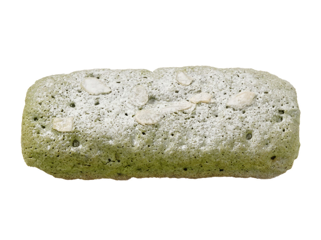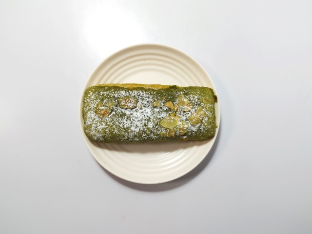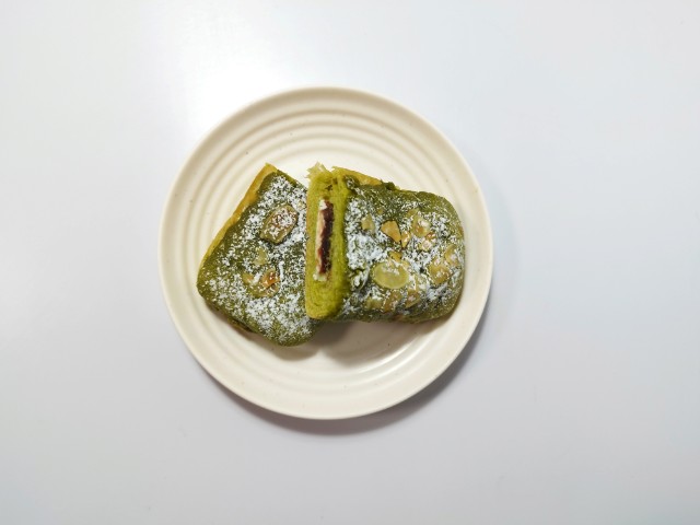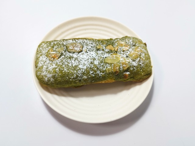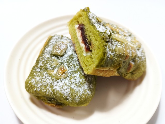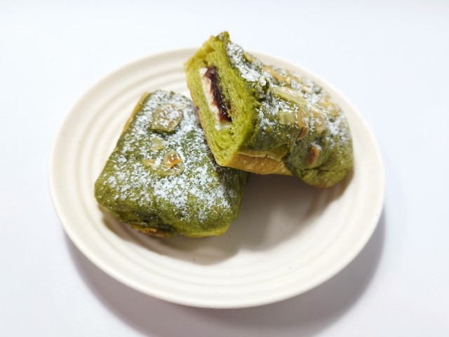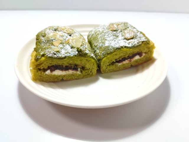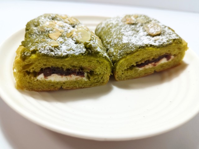 生地に抹茶を練り込み、アーモンドパウダーを使用したダマンド生地を掛けて焼き上げ、ホイップクリームとつぶあんをサンドした菓子パンです。