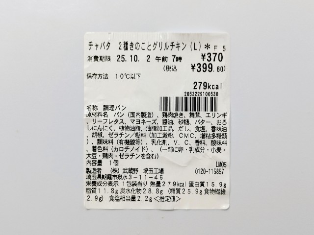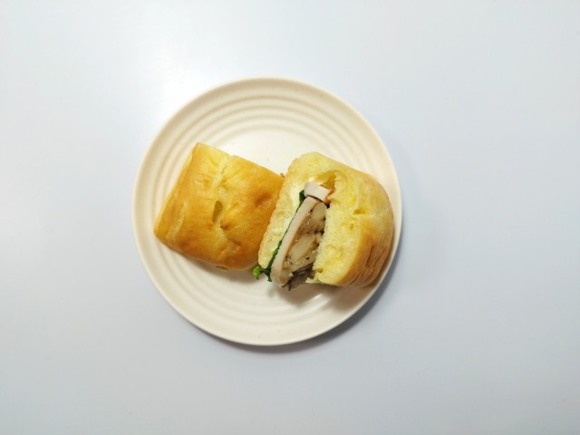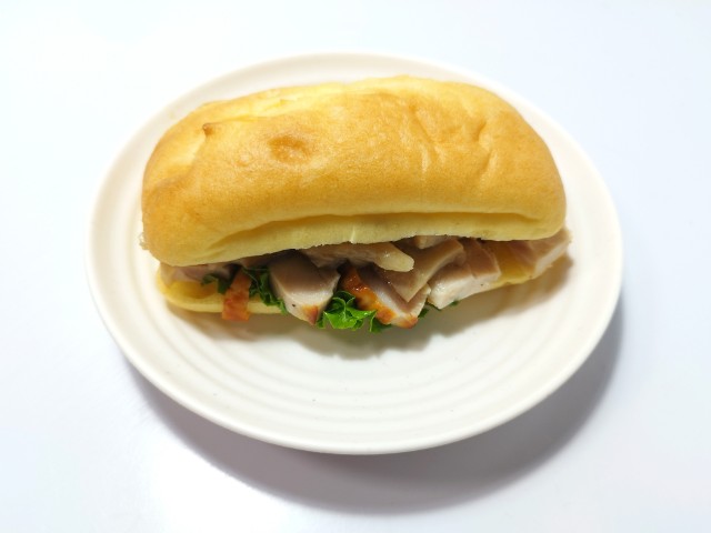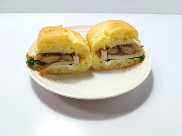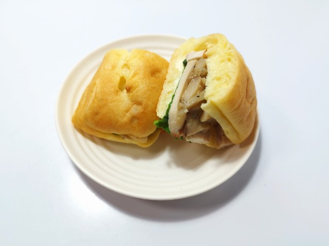 きのことグリルチキンをチャバタで挟んだサンドイッチです。セブンイレブンでは昨年の「旬を味わおう!秋の味覚祭」(2024年10月1日~10月14日)に続き、今年も「秋をほおばれ!」を9月23日より開催していて、今回の商品もその対象商品の一つとなっています。ちなみにチャバタをネットで調べたところ、イタリア発祥のシンプルでヘルシーな食事パンで、水分量が多く「スリッパ」を意味するイタリア語に由来した平たい形が特徴だそうです。そんなチャバタですが、生地はもっちりとした食感と歯切れの良さで、安定の美味しさです。具材としてエリンギと舞茸、グリルチキン、リーフレタスが挟んであって、きのこの味わいとチキンの旨味、バターの風味があって、生地とのバランスも良いです。全体的にはきのこの味わいがしっかりとしているといった印象で、きのこが好きな方にはたまらないと思います。大きさはお腹を軽く満たすにはちょうどよく、朝食や主食にあと一品追加したい時にピッタリです。ぜひ2種きのことグリルチキンのチャバタを食べてみて下さい。