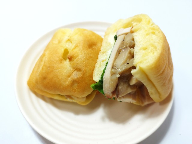 エリンギや舞茸、グリルチキンなどが挟まっています。