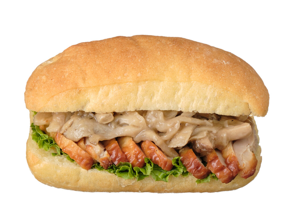2種類のきのことグリルチキンをチャバタに挟んだサンドイッチです。