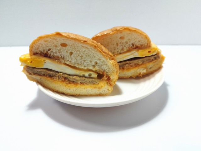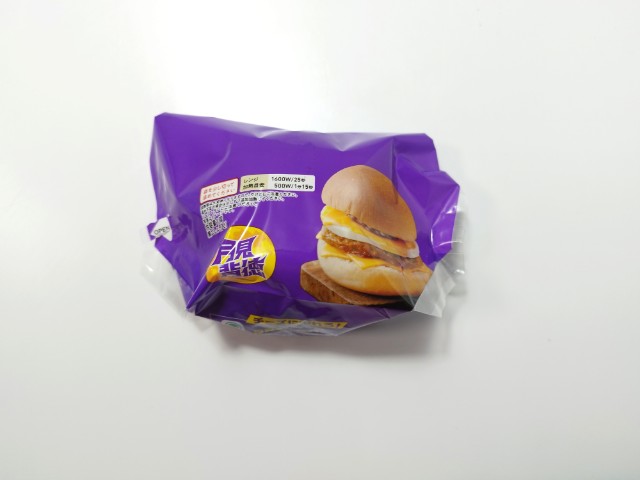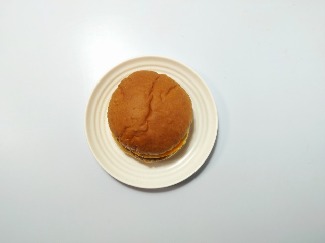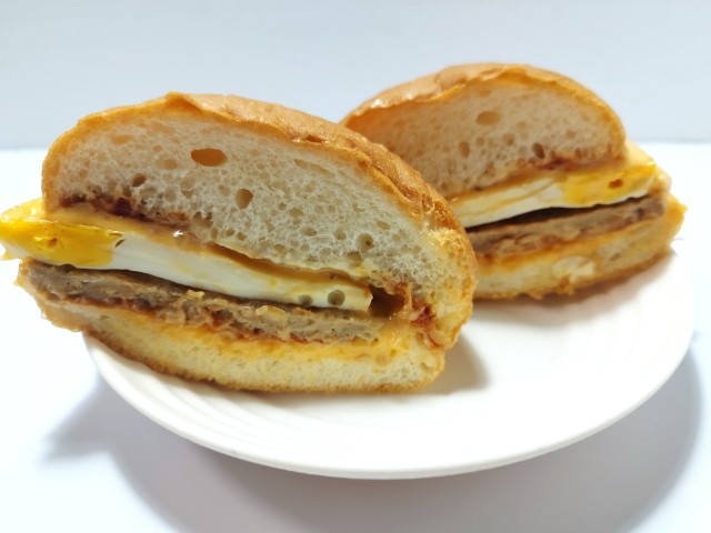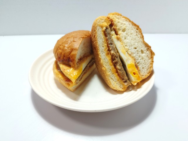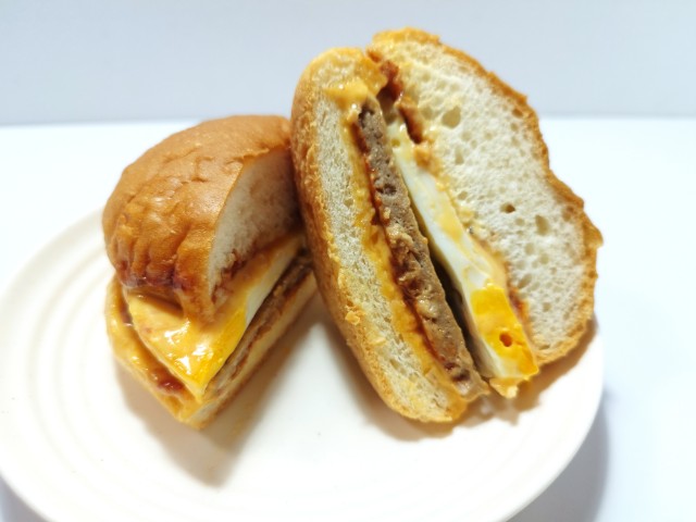 月見チーズバーガーです。ファミリーマートでは9月30日から普通の月見じゃモノ足りない!「月見背徳メシ」を開催していて、今回の商品もその対象商品の一つになっています。そんな月見チーズバーガーですが、バンズはふっくらとした食感と歯切れの良さで、安定の美味しさです。バンズには目玉焼きとハンバーグ、チェダーチーズが挟まっていて、目玉焼きは黄身のコクと白身のプルンとした食感、ハンバーグは肉の旨味とジューシーな味わいで、バンズとのバランスも良いです。ポイントはチェダーチーズで、今回は3枚トッピングしたというトリプルチーズの背徳仕様だけあって、チーズの濃厚な味わいととろける食感を楽しむ事が出来ます。他にも玉ねぎきゅうりのピクルス和えや黒こしょう入りマヨソースなども一緒に挟まっていて、最後のひと口まで飽きることなく食べられます。大きさは普通のハンバーガーサイズで、おやつや小腹が空いた時にピッタリです。ぜひ月見チーズバーガーを食べてみて下さい。