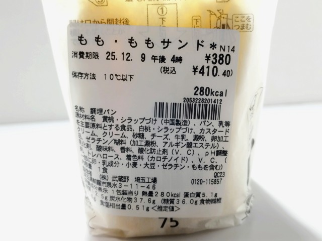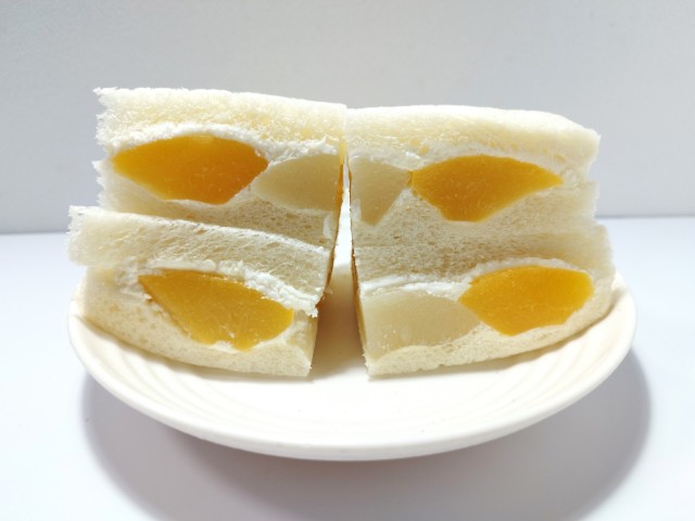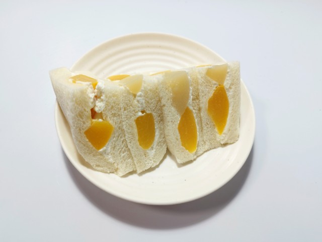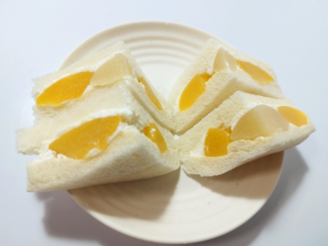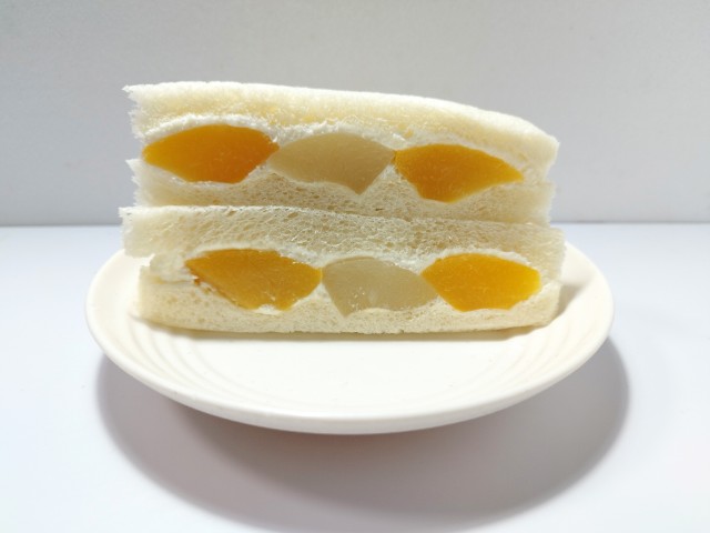 白桃と黄桃を挟んだフルーツサンドです。以前の購入が2025年10月1日発売だったので、約2ヶ月近く経っていますが、価格は変わっていません。そんなもも・ももサンドですが、白桃はとろけるような食感とジューシーな味わい、黄桃は桃の味わいと濃厚な甘味で、それぞれの味や食感を楽しめます。一緒に挟まっているカスタードクリームとホイップクリームを組み合わせたクリームは、なめらかな食感とミルクのコク、ほどよい甘味があって、桃とのバランスも良いです。大きさは普通のサンドイッチサイズで、朝食や小腹が空いた時にピッタリです。ぜひもも・ももサンドを食べてみて下さい。