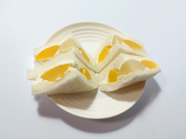 カスタードクリームとホイップクリームを組み合わせ、2種類の桃を使用したデザートサンドイッチです。