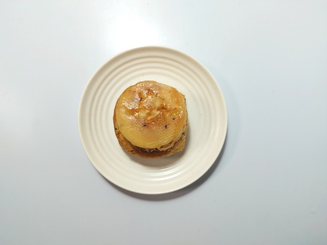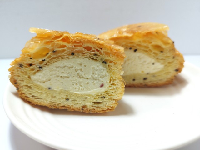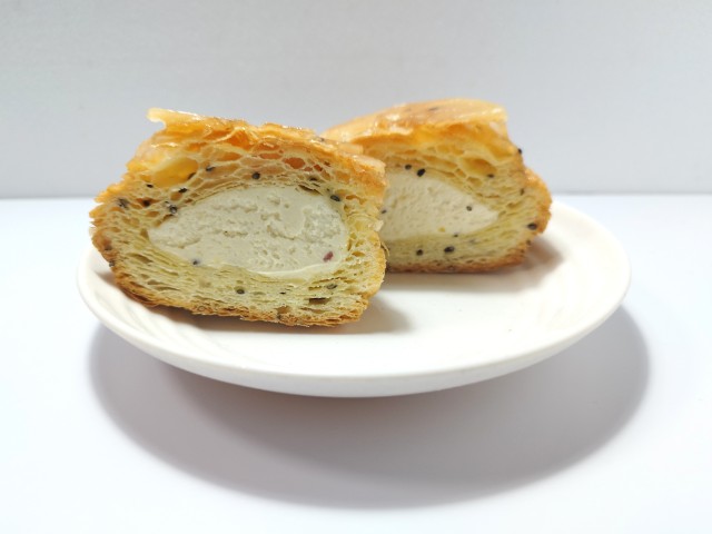 ブリュレデニッシュです。以前に7プレミアム ブリュレデニッシュ カスタード(2025年5月20日発売)がありましたが、今回は芋ホイップが使われています。そんなブリュレデニッシュですが、デニッシュ生地の周りには飴がコーティングされていて、カリカリとした食感としっかりとした甘味を楽しむ事が出来ます。デニッシュ生地はしっとりとした食感と歯切れの良さ、ごまの風味があって、飴コーティングとのバランスも良いです。中の芋ホイップはふんわりとした食感とさつまいもの風味で、美味しいのひと言です。全体的には甘味のあるスイーツといった感じですが、食感もしっかりと楽しめるので、最後のひと口まで飽きることなく食べられます。大きさは手のひらサイズくらいで、おやつや食後のデザートにピッタリです。ぜひ大学芋風のブリュレデニッシュを食べてみて下さい。