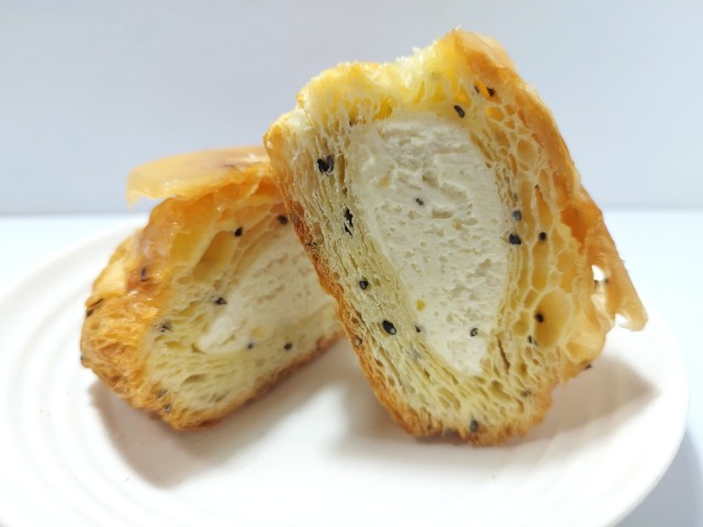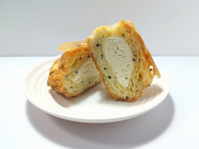黒ごま入りのデニッシュ生地となめらかな芋ホイップ,カリカリとした飴の食感が楽しめるパンスイーツです。