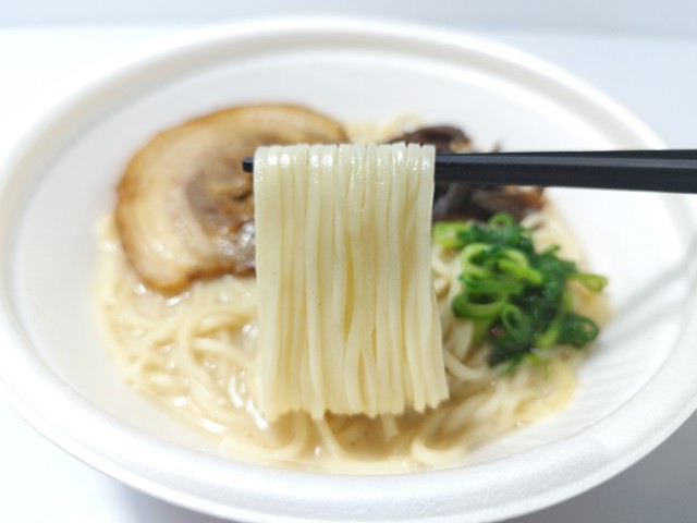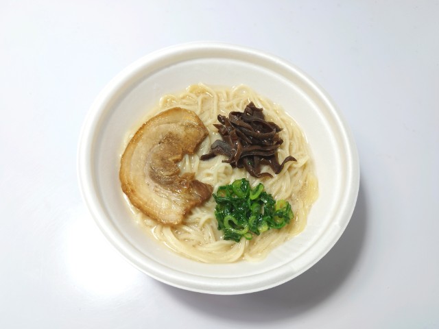 「博多一風堂」監修のとんこつラーメンです。歯切れのよい細麺に、コクと旨みをきかせた豚骨スープを合わせたとんこつラーメンです。具材として丸チャーシュー、きくらげ、青ねぎをトッピングしました。