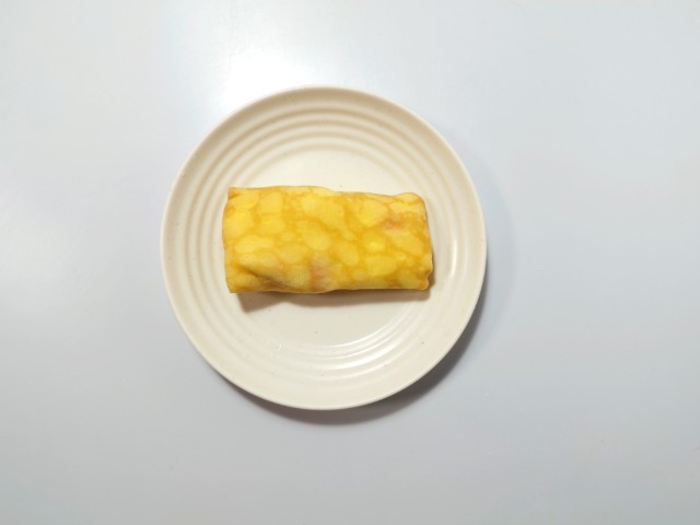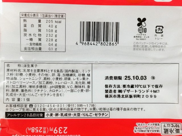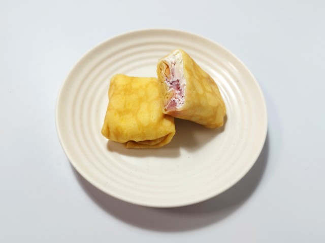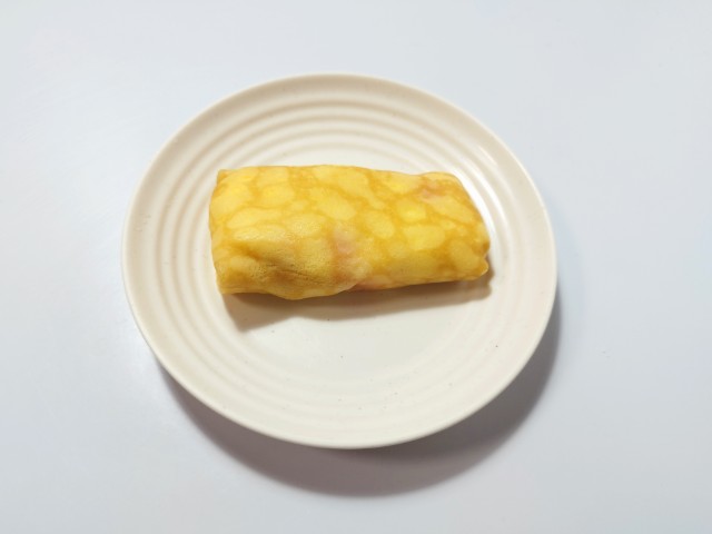 森永加糖れん乳を使ったクレープです。森永乳業とコラボした商品で、森永マミー風味シュークリーム(2025年9月30日発売)と同時発売された新商品です。そんなクレープですが、クレープ生地はもちもちとした食感とほんのりとした甘味があって、生地だけでも美味しく食べられます。森永加糖れん乳を使ったクリームはなめらかな食感と練乳の風味、森永加糖れん乳を使ったソースはとろりとした食感と練乳の甘味で、ハマってしまう美味しさです。練乳クリームなどと一緒に入っているいちごのソースといちごダイスはほどよい酸味といちごの風味で、味や食感のアクセントになっています。大きさは一人分にちょうどよく、おやつや食後のデザートにピッタリです。ぜひ森永れん乳風味クレープを食べてみて下さい。