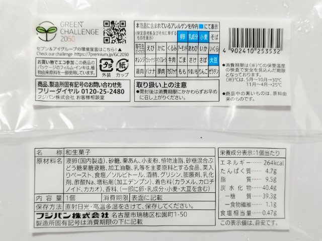 熱量:264kcal、たんぱく質:4.7g、脂質:9.5g、炭水化物:40.4g(糖質:39.3g、食物繊維:1.1g)、食塩相当量:0.47g