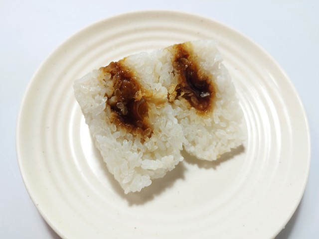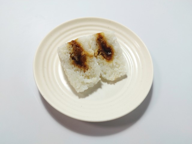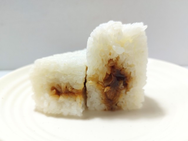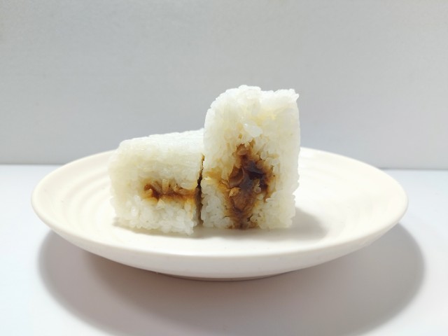 金目鯛の煮付けを使ったおむすびです。金目鯛の煮付けが中具になったおむすびで、個人的には楽しみにしていた新商品の一つでもあります。そんなおむすびですが、金目鯛の煮付けは甘辛い味付けと金目鯛の旨味、生姜の風味があって、ご飯が進む一品になっています。ご飯はふっくらとした食感とほのかな甘味があって、安定の美味しさです。金目鯛の煮付けを切り身や丸々一匹をご飯で食べるとそれだけでお腹いっぱいになってしまいますが、このおむすびならお弁当やカップ麺と合わせる事も出来ます。また、作る手間も含めて贅沢な味わいが手軽に食べられるという点では、タイパもかなり良いと思います。大きさは普通のおむすびサイズで、小腹が空いた時や主食にあと一品追加したい時にオススメです。ぜひ金目鯛の煮付けのこだわりおむすびを食べてみて下さい。