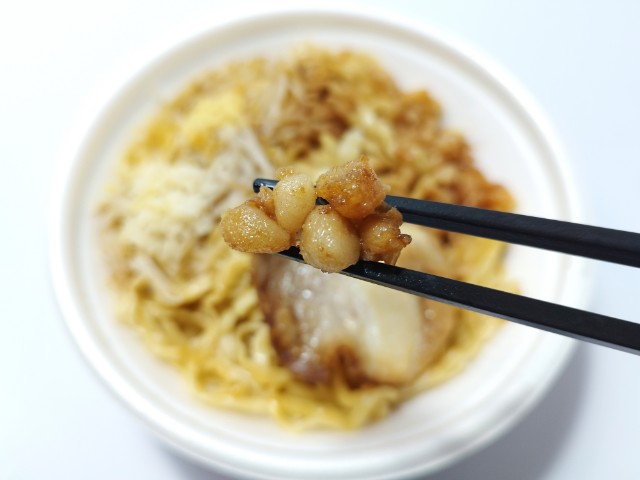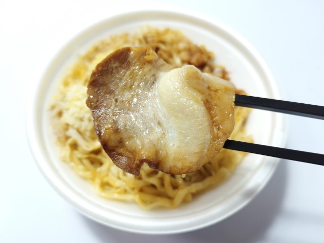 頑者監修の背脂マシマシ魚介豚骨まぜそばです。以前の購入が2025年10月7日発売だったので、約3ヶ月以上経っていますが、価格が690円(税込745円)から647円(税込698円)に商品名が【名店監修だから本格的!うまい麺!】頑者監修 背脂マシマシ魚介豚骨まぜそばから背脂マシマシ魚介豚骨まぜそばへと変わっています。そんな背脂マシマシ魚介豚骨まぜそばですが、魚粉の風味とにんにくの味わい、背脂のコクを感じる醤油ダレは、濃厚な味わいながら後味のしつこさがありません。太麺のちぢれ麺はもちっとした食感と小麦の風味で、タレとのバランスも良いです。具材には丸チャーシューや魚粉、背脂、にんにく、刻みしょうがなどがのっていて、それぞれの味や食感を楽しめます。撮影では見た目もあって、軽くしか混ぜていませんが、しっかりと混ぜて食べるのがオススメです。もちろん、食べる時にはしっかりと混ぜて食べています。内容量は1食分にちょうどよく、お腹にも満たされます。ぜひ背脂マシマシ魚介豚骨まぜそばを食べてみてください。