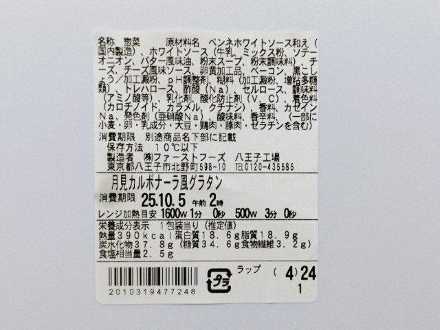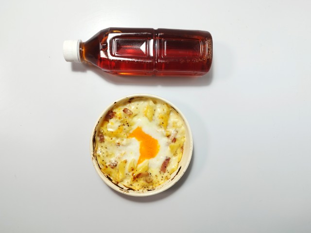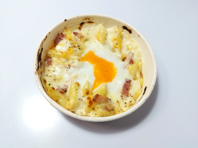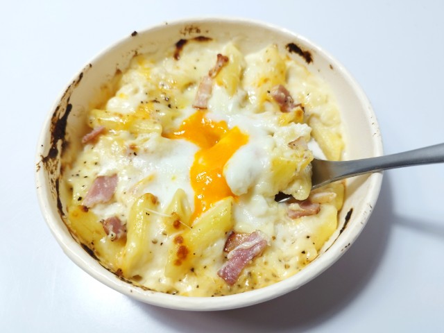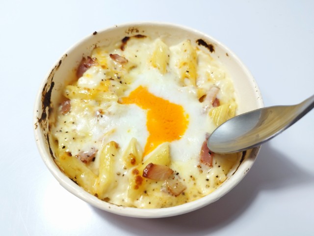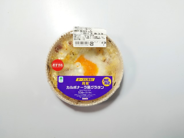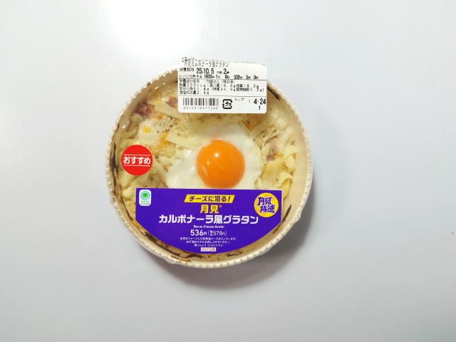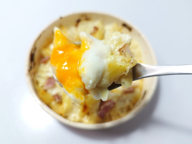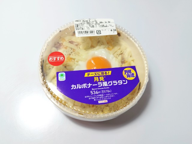 ファミリーマートの商品「【月見背徳メシ】チーズに沼る!月見カルボナーラ風グラタン」を食べてみました。