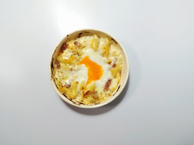 ホワイトソースとチーズソースを使ったカルボナーラ風のグラタンです。ファミリーマートでは9月30日から普通の月見じゃモノ足りない!「月見背徳メシ」を開催していて、今回の商品もその対象商品の一つになっています。そんな月見カルボナーラ風グラタンですが、ホワイトソースはクリーミーな味わいとにんにくの風味があって、ペンネとの相性抜群です。チーズソースはなめらかな食感とチーズのコク、ほどよい塩味で、グラタンの美味しさをより引き立てています。とにかくチーズの量が多いので、チーズ好きにはたまらない一品だと思います。内容量は1食分にちょうどよく、お腹も満たされます。ぜひ月見カルボナーラ風グラタンを食べてみて下さい。