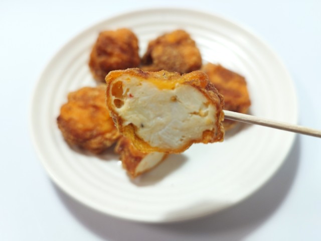 七味唐からしを使ったからあげクンです。以前にからあげクン 七味唐からし味(2024年1月23日発売)がありましたが、今回はマヨネーズが追加されています。ちなみにローソンの商品説明にもある八幡屋礒五郎はやわたやいそごろうと読むらしく、長野県長野市の七味唐辛子メーカーで、東京都浅草寺のやげん堀、京都府清水寺の七味家と共に、日本三大七味唐辛子の一つに挙げられているそうです。そんなからあげクンですが、味は七味唐からしの風味とピリッとした辛味、マヨネーズの酸味があって、クセになってしまう美味しさです。パッケージには辛さ注意と書かれていますが、個人的にはそこまで辛味は感じませんでした。ただ、辛いのが苦手な方は注意した方が良いと思います。今回は10月7日~10月13日までからあげクン&海からクン1個増量らしく、6個入になっていましたが、通常時は5個入となっています。もちろん5個入でも6個入でも、1個はひと口サイズなので、一人でも普通に食べ切れます。ぜひからあげクンの七味唐からしマヨ味を食べてみて下さい。